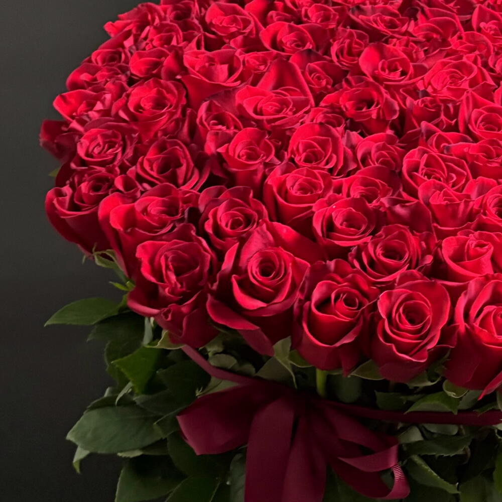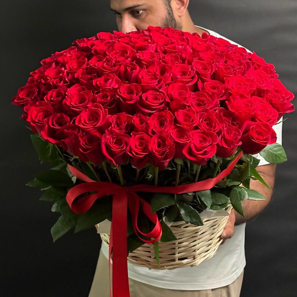 Cesta de 100 rosas rojas ❤️ Un símbolo clásico de amor y pasión — 100 rosas rojas de primera calidad dispuestas en una lujosa cesta. Perfecta para expresar sentimientos sinceros y hacer que cualquier ocasión sea inolvidable.