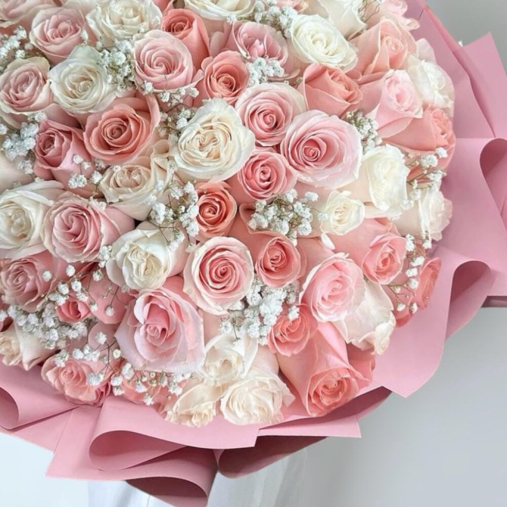 pink roses - 50 ud. rosas blancas - 50 ud. manojo de gypsophila - 1 ud.
