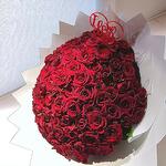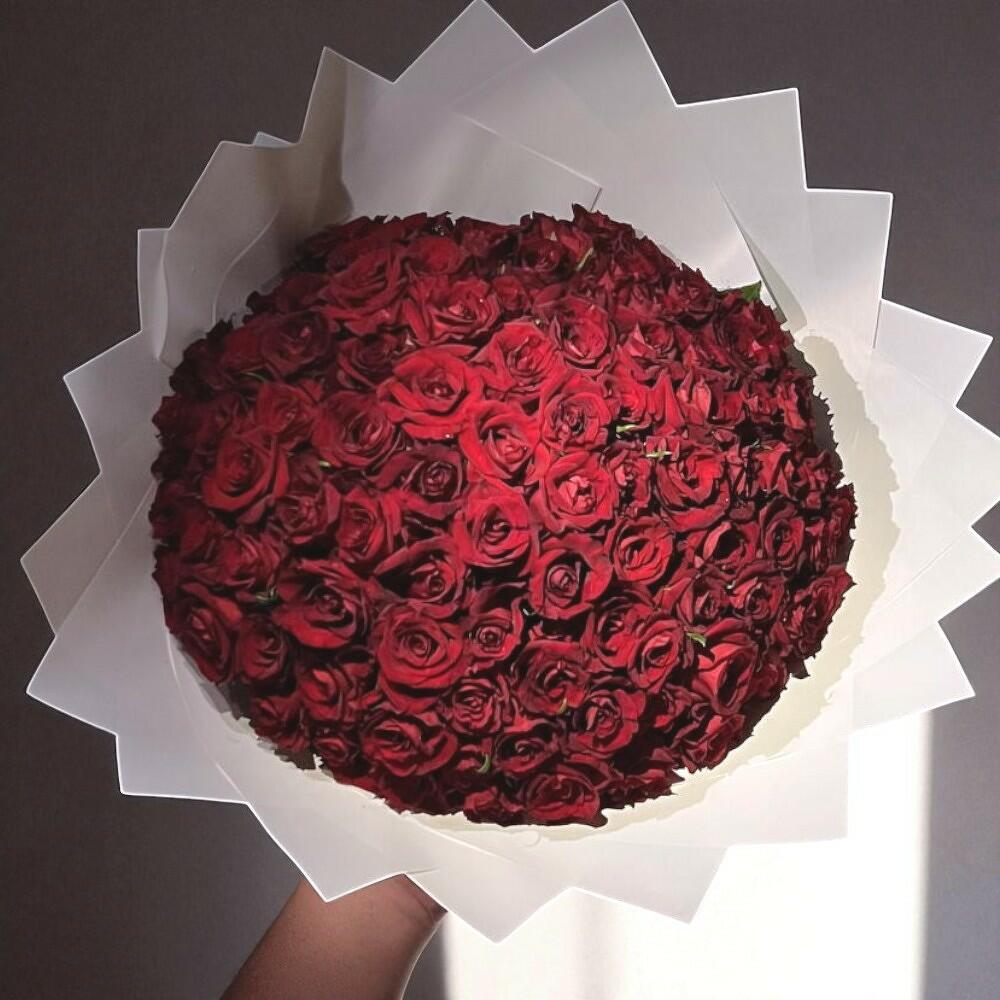 Un exuberante y lujoso ramo de 100 rosas de un rojo intenso que habla el idioma de la pura pasión y el romance. Cada rosa está cuidadosamente seleccionada por su color intenso y sus pétalos aterciopelados, creando una impactante composición redonda que luce dramática desde cualquier ángulo. Las flores están envueltas en un elegante papel de diseñador blanco con bordes nítidos, haciendo que el ramo parezca salido de un cuento de hadas. Perfecto para aniversarios, grandes declaraciones de amor o cualquier momento en que las palabras no sean suficientes. Mantenga el ramo en una habitación fresca, alejado de la luz solar directa y de fuentes de calor. Cambie el agua a diario, recorte los tallos en diagonal unos 1 cm cada dos días y quite cualquier hoja por debajo de la línea del agua para prolongar la frescura. Puede enviarnos un mensaje para modificar el color del envoltorio. Los colores disponibles son negro, blanco y rojo. Puede solicitar que se retire el palito acrílico "I love you" si no lo requiere.