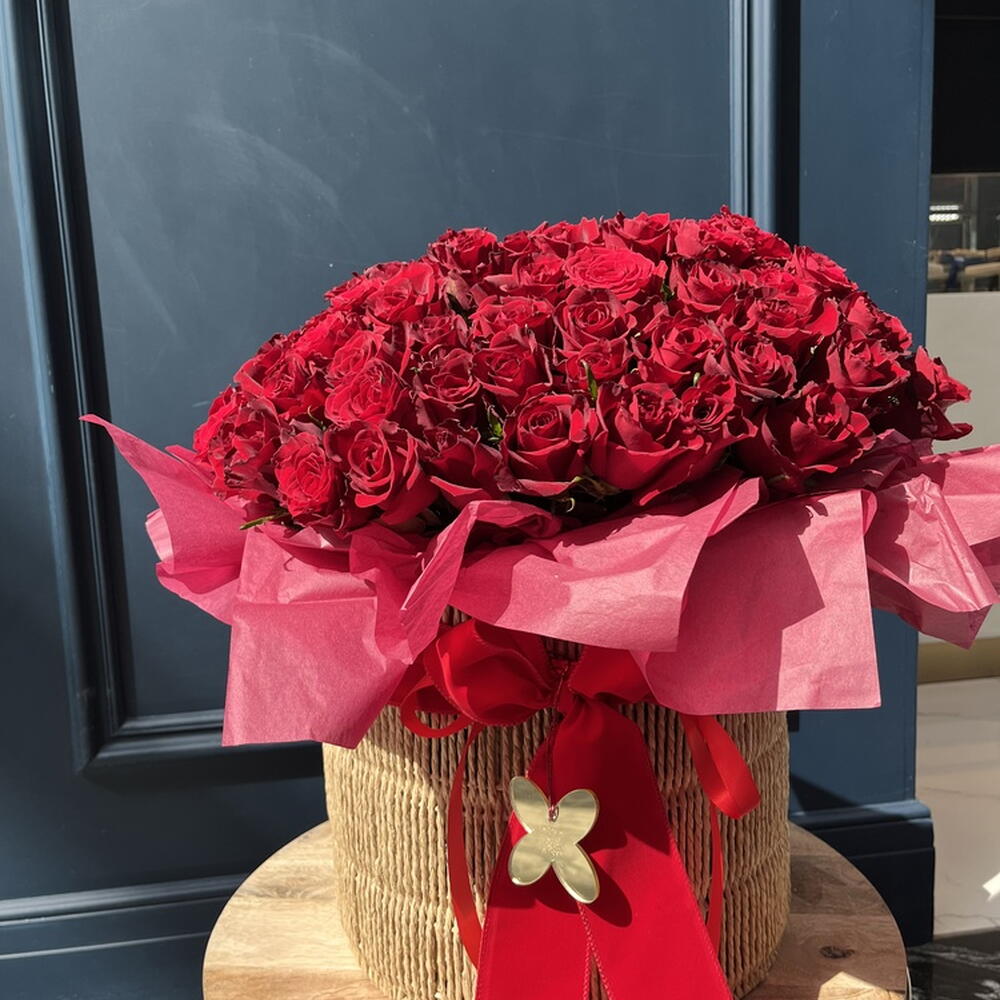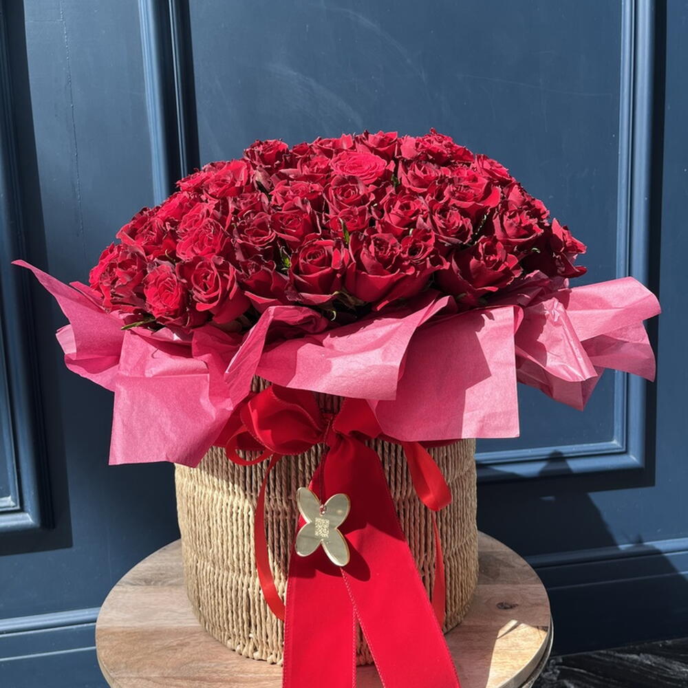 Composition: rose red - 101, basket - 1 Sizes: WIDTH - 50CM; HEIGHT - 60CM; LENGTH - 60CM; (including packaging) Размер: 50 x 60 x 60 см