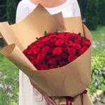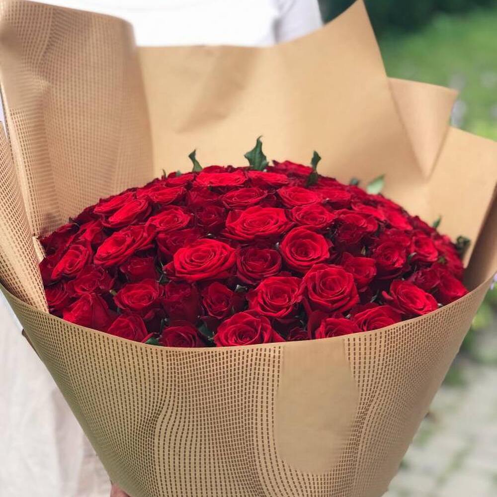 Composición: Rosa roja - 101, Envuelto - 7, Cinta - 2 Tamaños: ANCHO - 55 CM; ALTO - 90 CM; LARGO - 90 CM (incluido el embalaje) Dimensiones: 55 x 90 x 90 cm