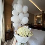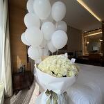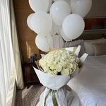 Composición: globos blancos - 20, rosas blancas - 101 Dimensiones: ANCHO - 55CM; ALTURA - 65CM; LARGO - 65CM; (incluyendo embalaje) Tamaño: 55 x 65 x 65 cm