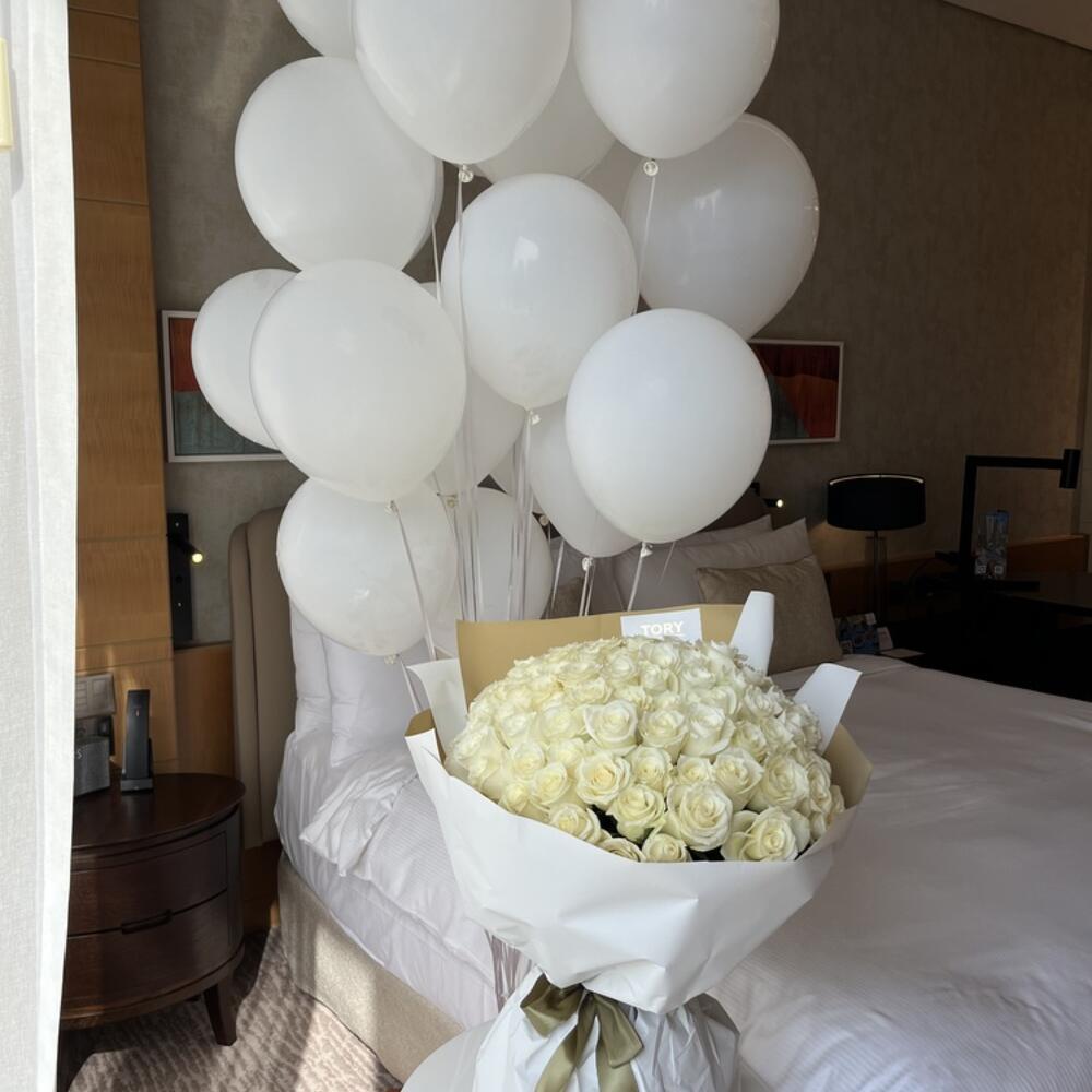 Composición: globos blancos - 20, rosas blancas - 101 Dimensiones: ANCHO - 55CM; ALTURA - 65CM; LARGO - 65CM; (incluyendo embalaje) Tamaño: 55 x 65 x 65 cm