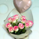 Combo de ramo de 11 rosas Jumilia color rosa y globo foil en forma de corazón color beige inflado con helio.