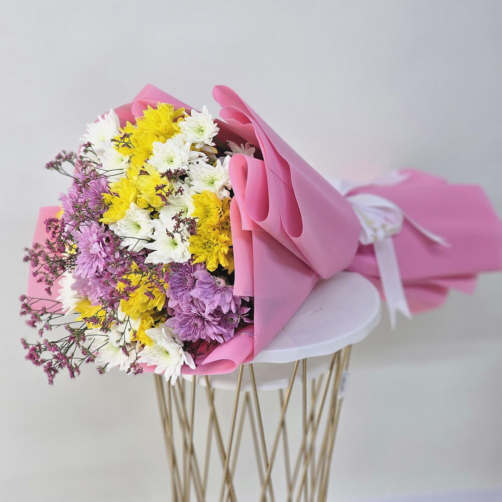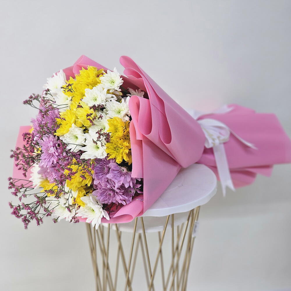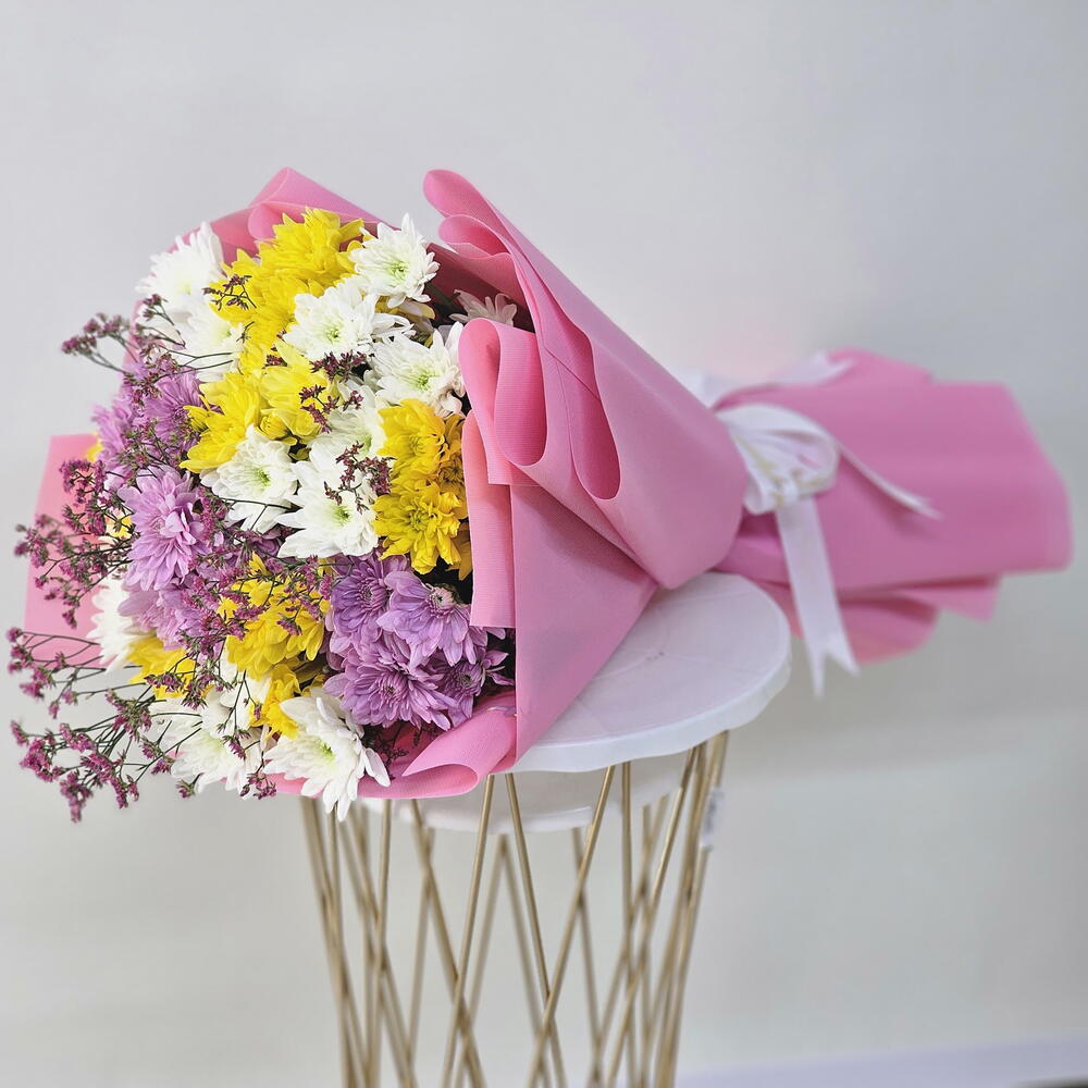 Alegra cualquier ocasión con nuestro Ramo de 13 Crisantemos Mixtos, un encantador arreglo lleno de color y alegría. Este ramo presenta una hermosa mezcla de crisantemos amarillos, rosas y blancos, que simbolizan felicidad, amor y pureza. Envuelto en un suave envoltorio rosa, este ramo irradia dulzura y calidez, lo que lo convierte en el regalo perfecto para alegrar el día y demostrar cariño. La combinación de amarillo vibrante, rosa suave y blanco nítido crea una presentación armoniosa y alegre que sin duda dejará una huella imborrable. Ya sea para un cumpleaños, un agradecimiento o simplemente porque sí, este ramo es una forma maravillosa de expresar tus más sinceras emociones con gracia y encanto. Perfecto para: Celebraciones, cumpleaños, deseos de pronta recuperación o como una sorpresa especial para alguien especial.