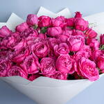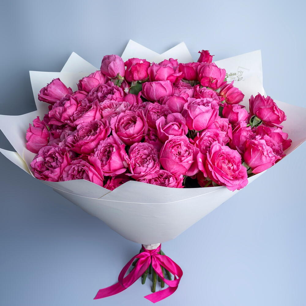 Ramo de 15 tallos de rosas spray peonía julieta premium, envuelto en papel natural y atado con cinta.