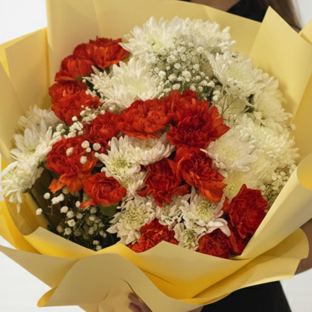 Celebre el amor, el respeto y la pureza con este elegante ramo de flores mixtas, cuidadosamente diseñado para transmitir emociones profundas. 15 claveles rojos vibrantes que simbolizan profundo amor y admiración. 10 elegantes crisantemos blancos que representan honestidad, paz y recuerdo. Atado a mano con maestría y envuelto en un empaque premium para un acabado lujoso. Este ramo es versátil y significativo, perfecto para gestos románticos, disculpas sinceras, cumpleaños, aniversarios, condolencias o simplemente para demostrar cariño. Pida hoy mismo el ramo Love Peace y envíe una expresión atemporal de sinceridad, respeto y afecto, con entrega fresca en todo Dubái.