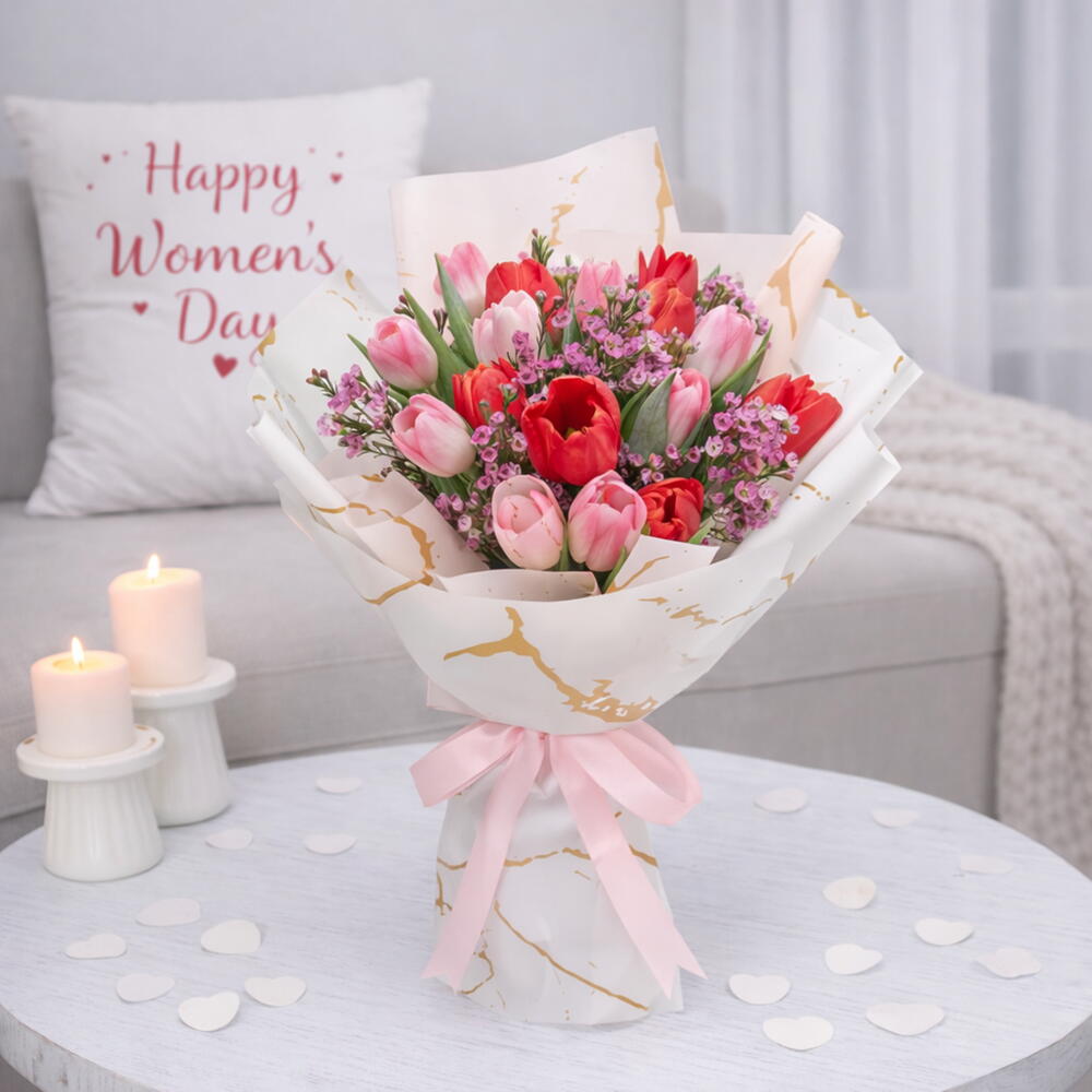 Descripción - Hermoso ramo de 15 tulipanes rojos y rosas con cera rosa en un envoltorio de mármol blanco atado con un lazo de cinta rosa.