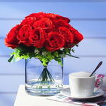 15 rosas rojas en florero de vidrio