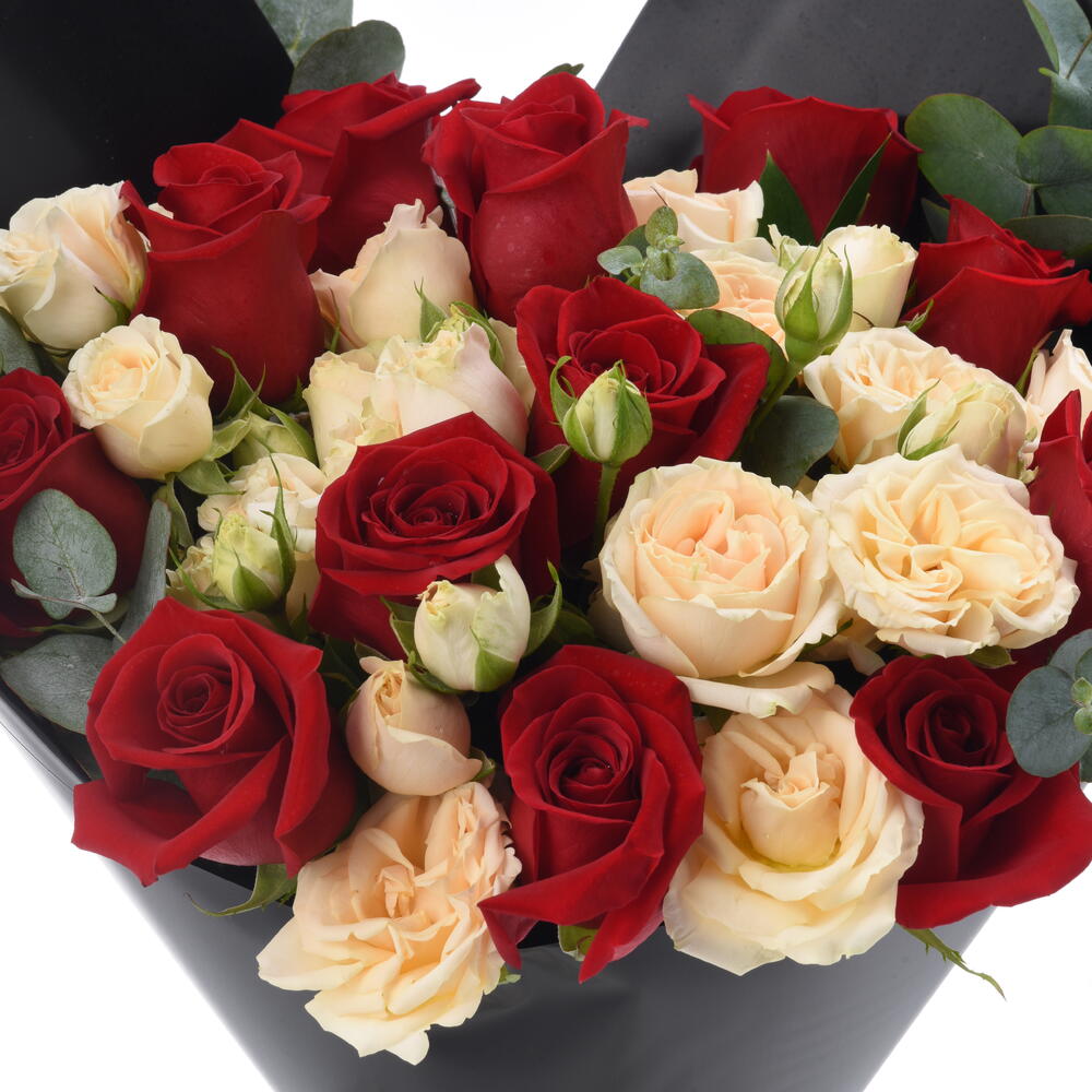 Eucalyptus - 4 ud. Ruscus - 5 ud. red roses - 12 ud. rosas en spray color melocotón - 8 ud.