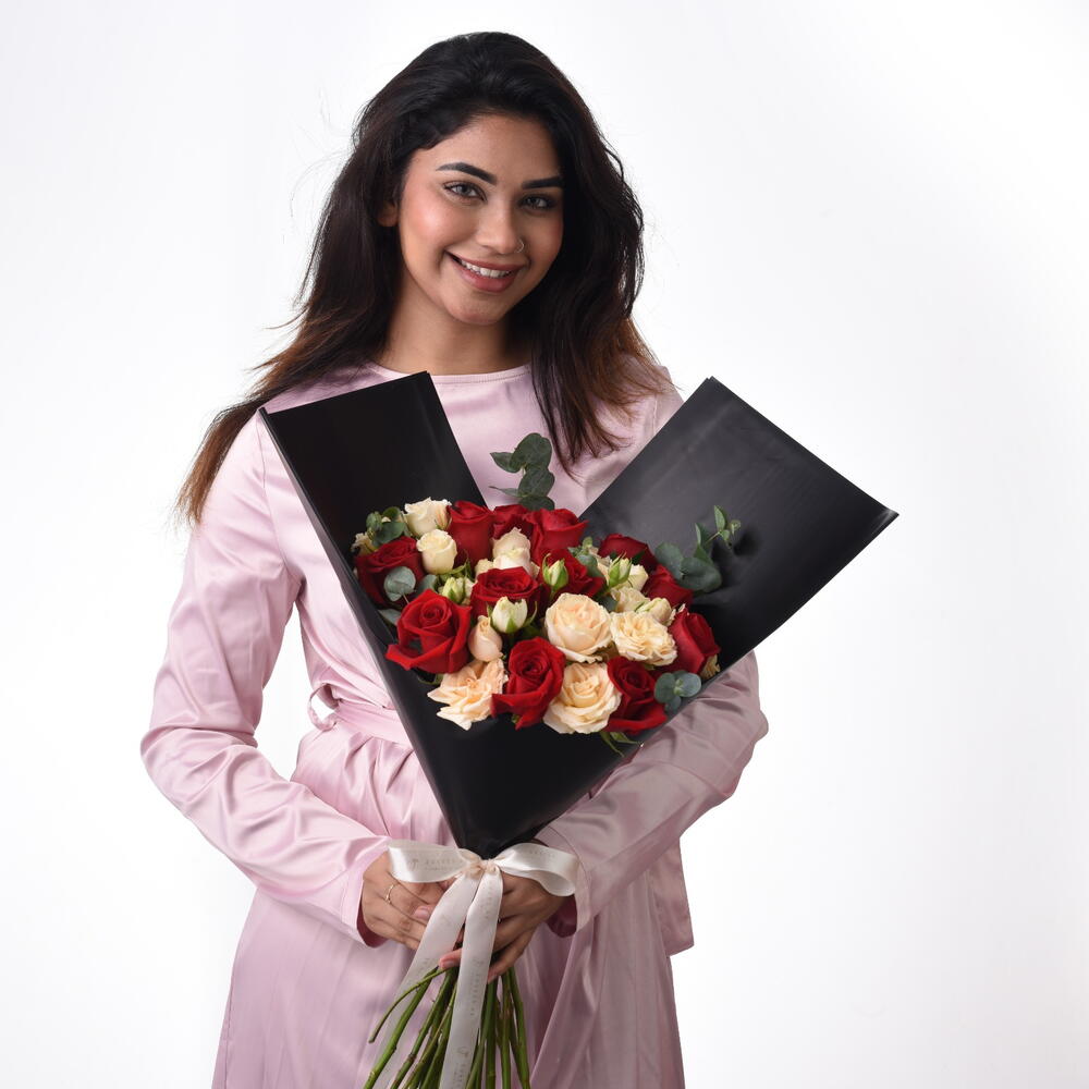 Un ramo donde la pasión se encuentra con la ternura: el Ramo de 20 rosas rojas y melocotón es una elegante sinfonía de tonos rojo intenso y melocotón suave. Cuidadosamente arreglado a mano en un lujoso envoltorio negro y atado con una cinta de raso, este arreglo habla por sí solo cuando las palabras se quedan cortas. Ya sea que estés expresando afecto, admiración o celebrando un momento significativo, sus tonos intensos y sus texturas elegantes prometen dejar una impresión inolvidable.