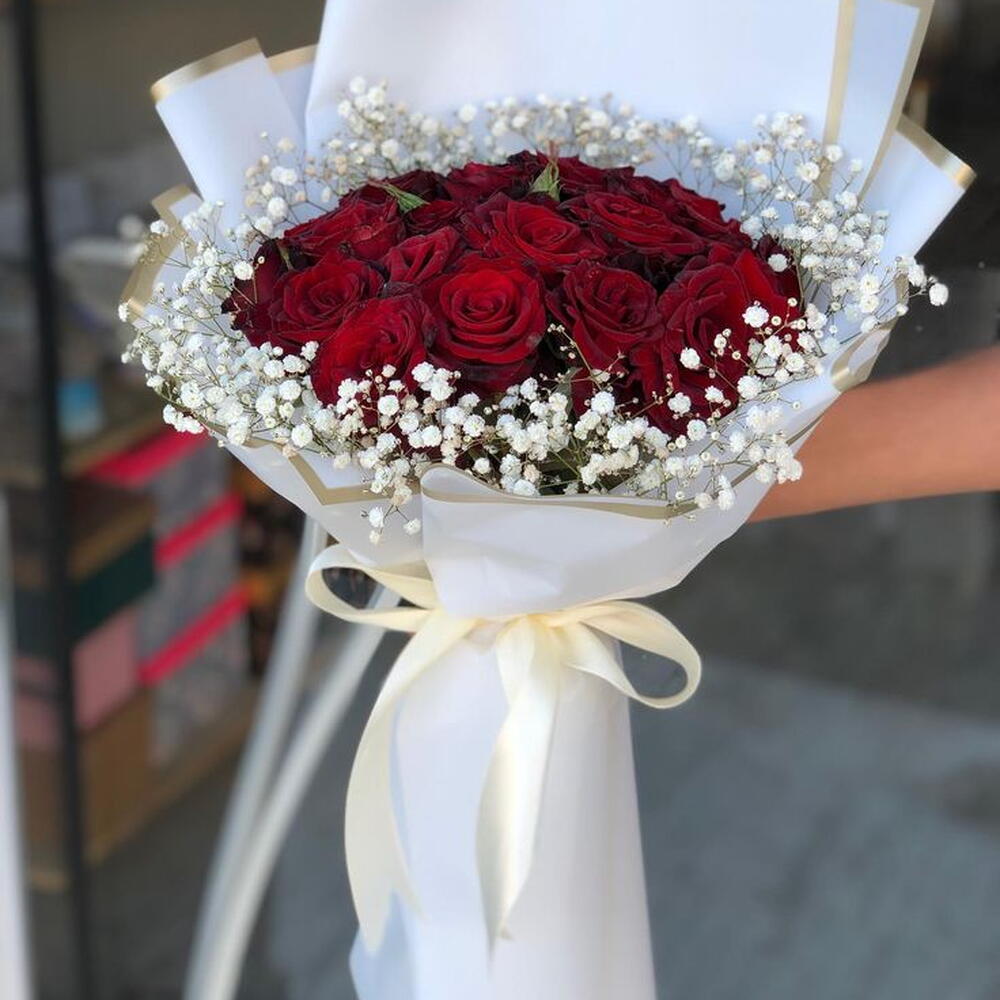 Este Ramo Rojo y Blanco... es un arreglo sencillamente hermoso que combina apasionadas rosas rojas y delicadas flores blancas de relleno, creando un look clásico y romántico. Tiene el tamaño perfecto para un regalo especial que realmente deja huella. Características principales Amor eterno: Veinte vibrantes rosas rojas son la pieza central, una clara declaración de afecto y compromiso. Detalle delicado: La pequeña Gypsophila blanca (gypsophila) aporta una textura suave y romántica que realza las rosas rojas. Tamaño ideal: Este ramo es abundante y tiene las proporciones perfectas para regalar y exhibir: Ancho: 30 cm Alto: 35 cm Composición del artículo El arreglo está elaborado cuidadosamente con estos materiales de calidad: Rosas rojas: 20 unidades Gypsophila: 2 unidades Hojas de regalo: 3 unidades Cinta de raso: 1 unidad Precio especial con descuento Consigue este encantador ramo a un precio excelente: Precio original: 200 AED Precio con descuento: 148 AED (¡26 % de descuento!)