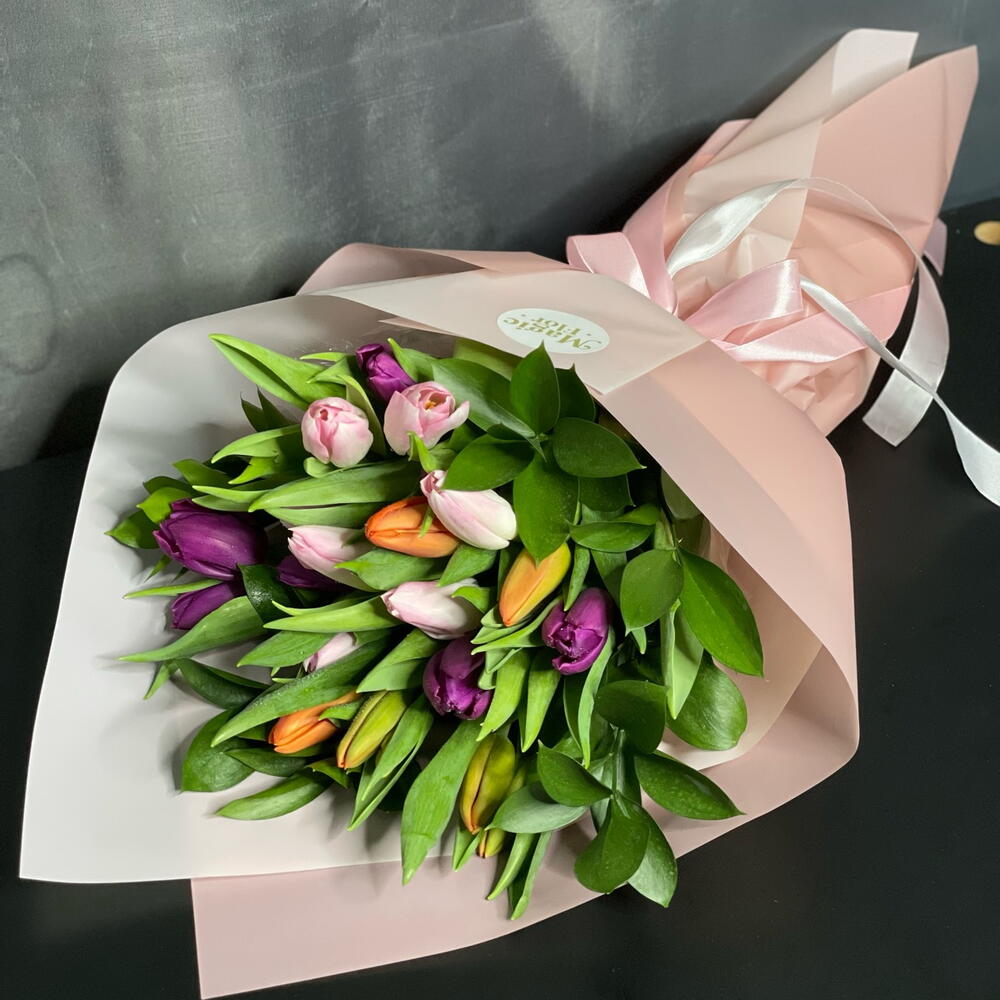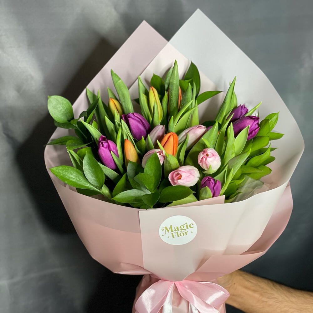A beautiful bouquet of 21 fresh mix color tulips, carefully arranged and elegantly wrapped, creating a soft and charming floral gift🌷