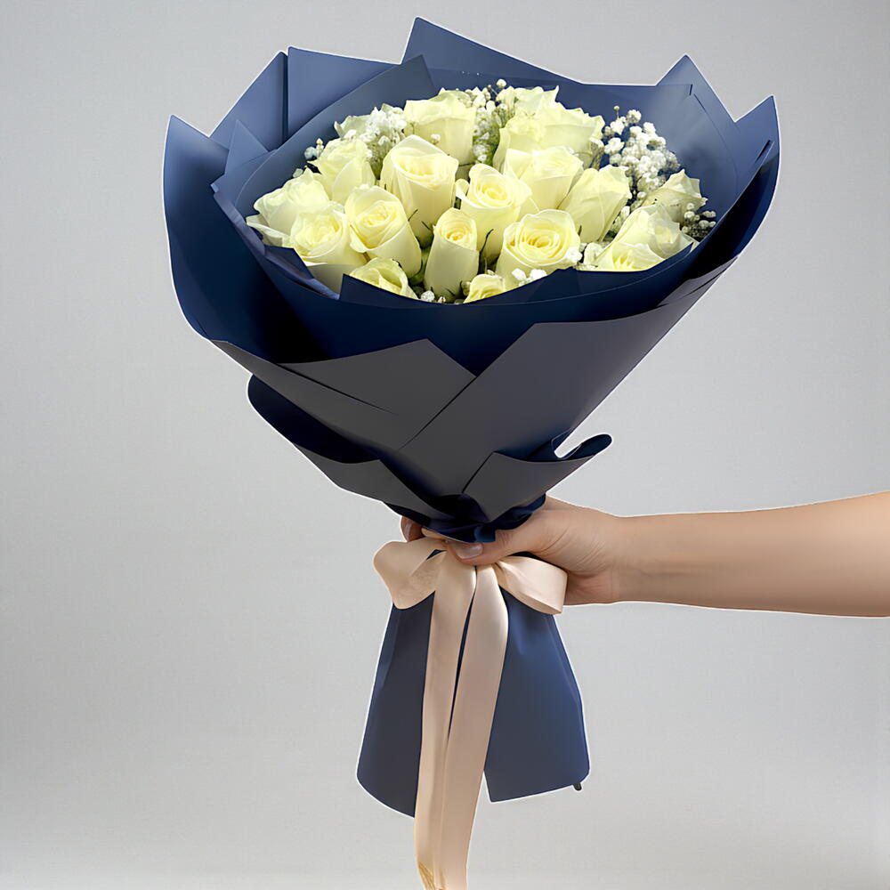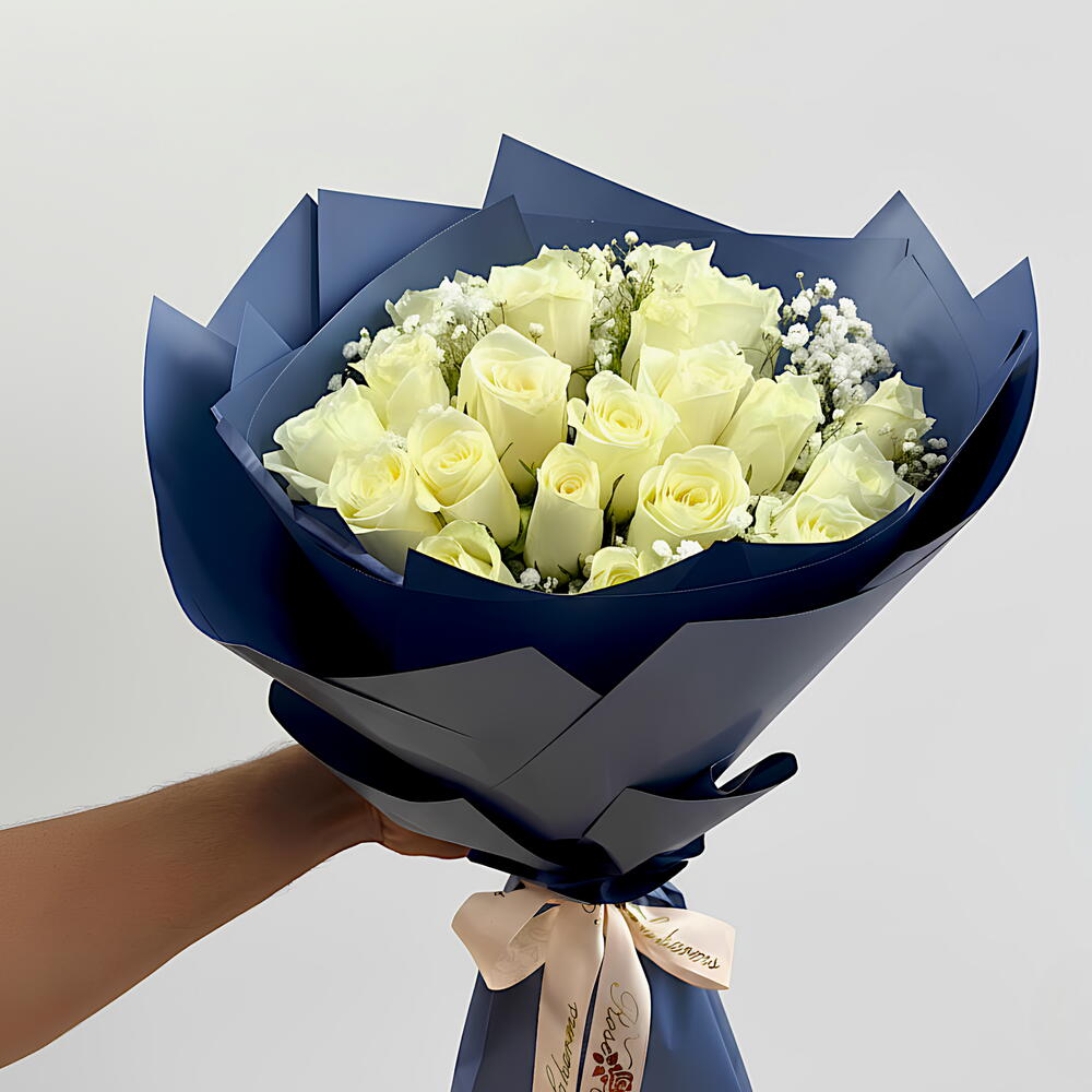 Un elegante ramo de 21 rosas blancas inmaculadas, hermosamente envuelto en azul elegante, simbolizando pureza y tranquilidad. Este encantador arreglo es el regalo perfecto de San Valentín para expresar tus sentimientos más sinceros con una belleza atemporal.