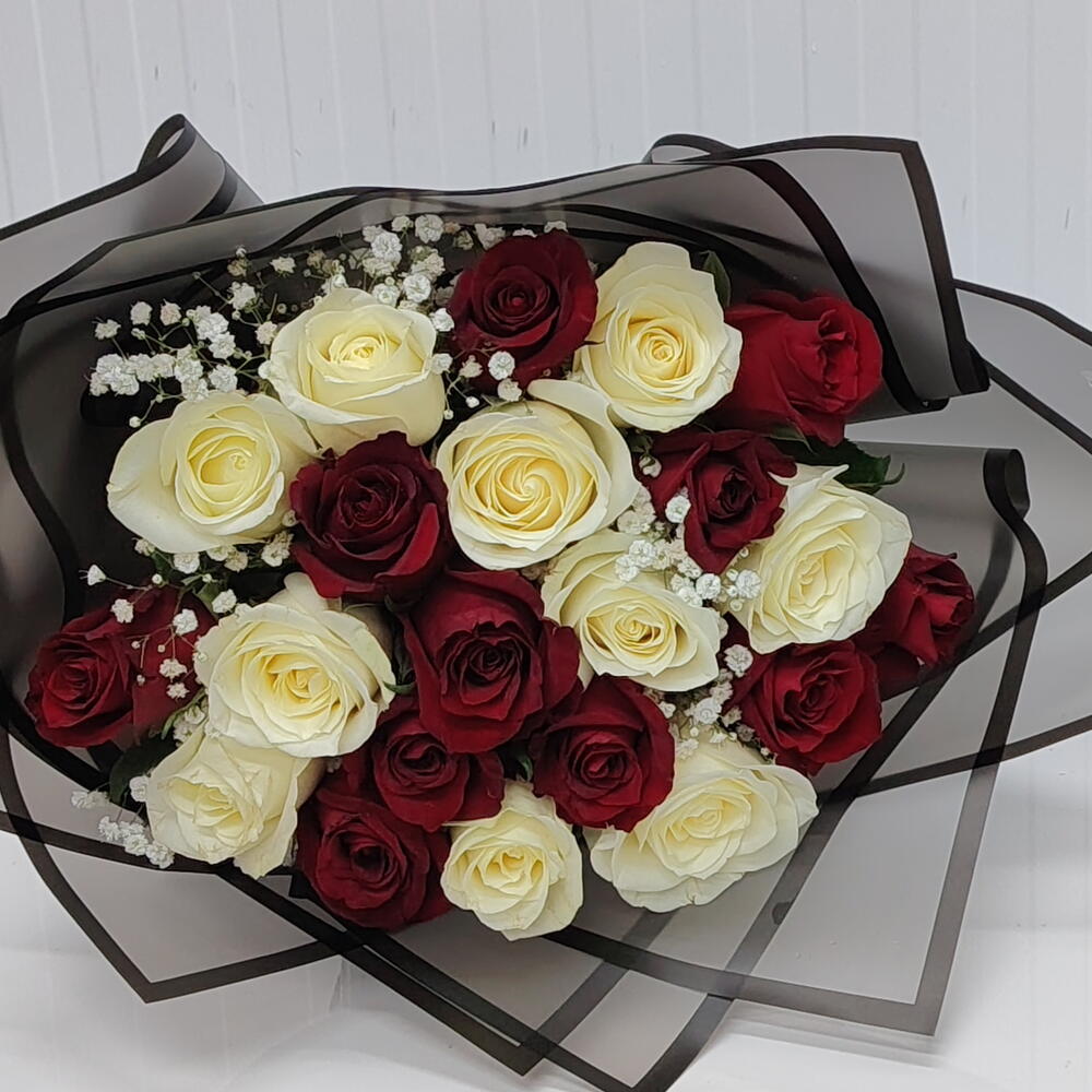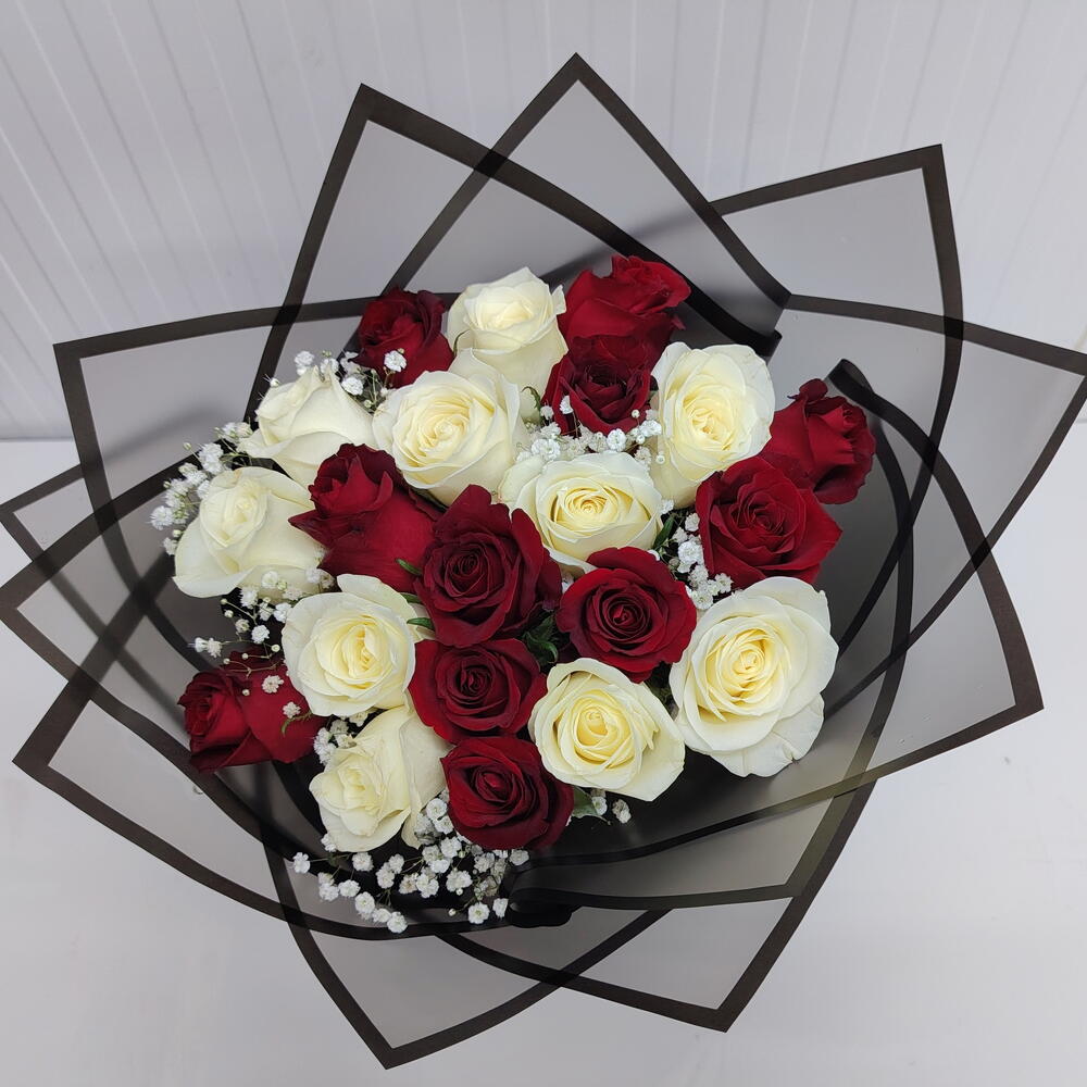 Ramo de 21 rosas rojas y blancas