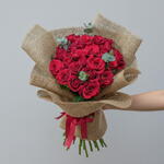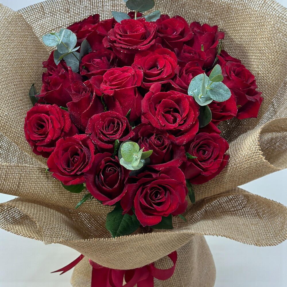 Atemporal, elegante y lleno de pasión: este ramo de 21 rosas rojas frescas está bellamente envuelto en tela de cáñamo natural, añadiendo un toque de sofisticación rústica a su encanto romántico. Cada rosa ha sido cuidadosamente seleccionada por su color intenso y sus exuberantes pétalos, creando un ramo que simboliza a la perfección el amor, la admiración y la emoción sincera. Ideal para ocasiones románticas, aniversarios o simplemente para decir «Te quiero», este diseño combina lujo y sencillez en perfecta armonía. ✨ 🌹 Expresa tu amor con estilo: ¡pide hoy mismo tu ramo de 21 rosas rojas envuelto en cáñamo y recíbelo el mismo día en Dubái!