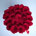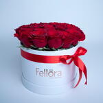 21 rosas rojas dispuestas en una caja redonda blanca y atadas con cinta