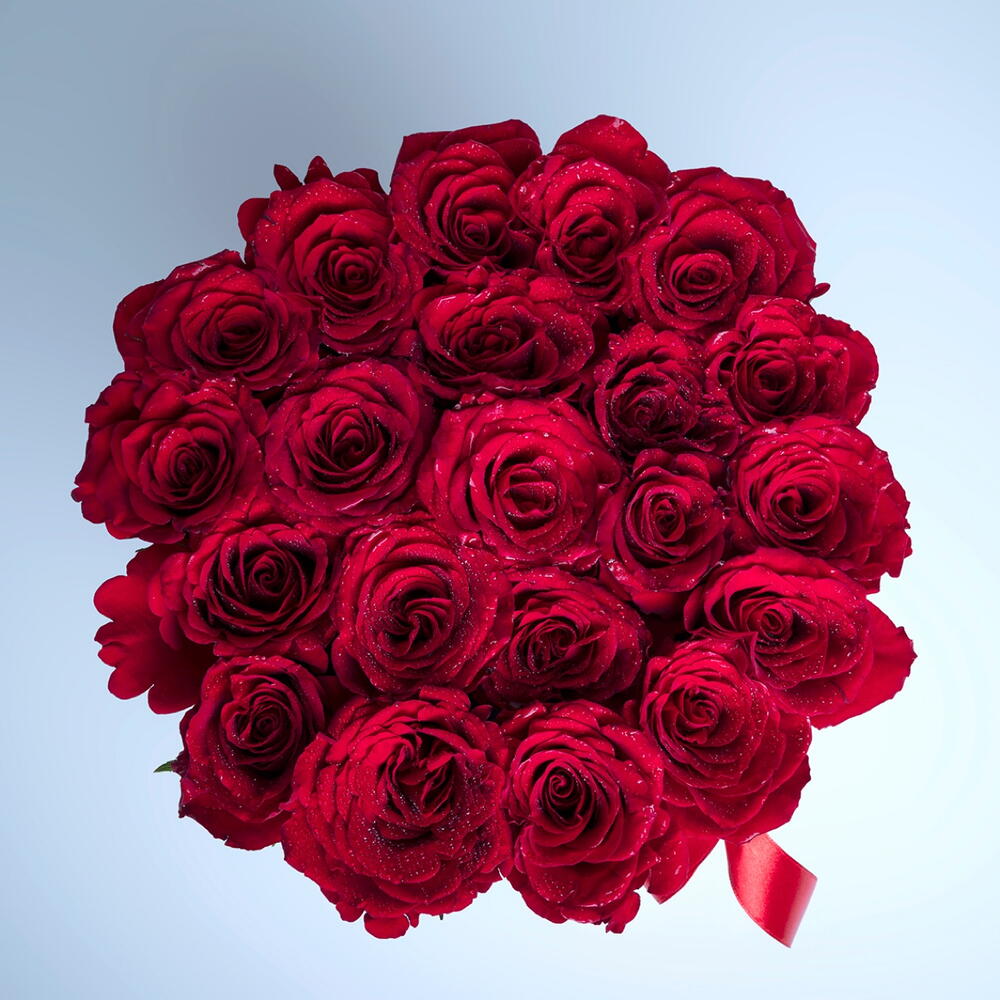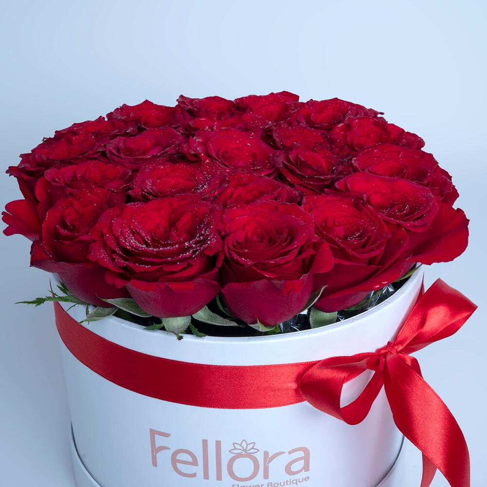 21 rosas rojas dispuestas en una caja redonda blanca y atadas con cinta