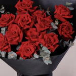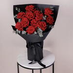 un ramo de rosas rojas elegantemente envuelto en papel negro. Flores: El ramo presenta numerosas rosas de un rojo intenso, que son símbolos universalmente reconocidos del amor y la pasión. Arreglo: Las rosas están dispuestas en un estilo clásico y redondeado, acentuadas con algo de follaje verde (probablemente hojas de eucalipto) para contraste.