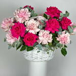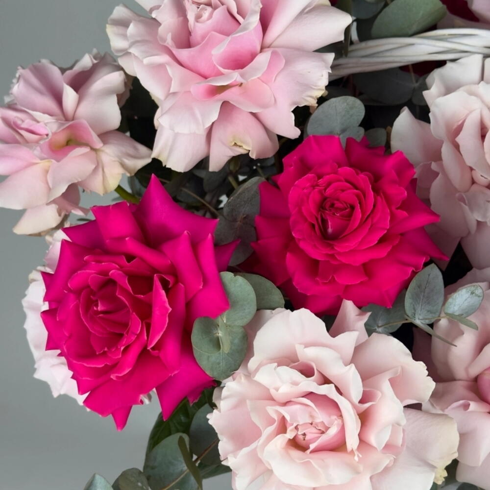 Basket - 1 ud. eucalyptus leaves - 8 ud. rosas clásicas rosa suave - 26 ud. rosas clásicas fucsia - 25 ud.