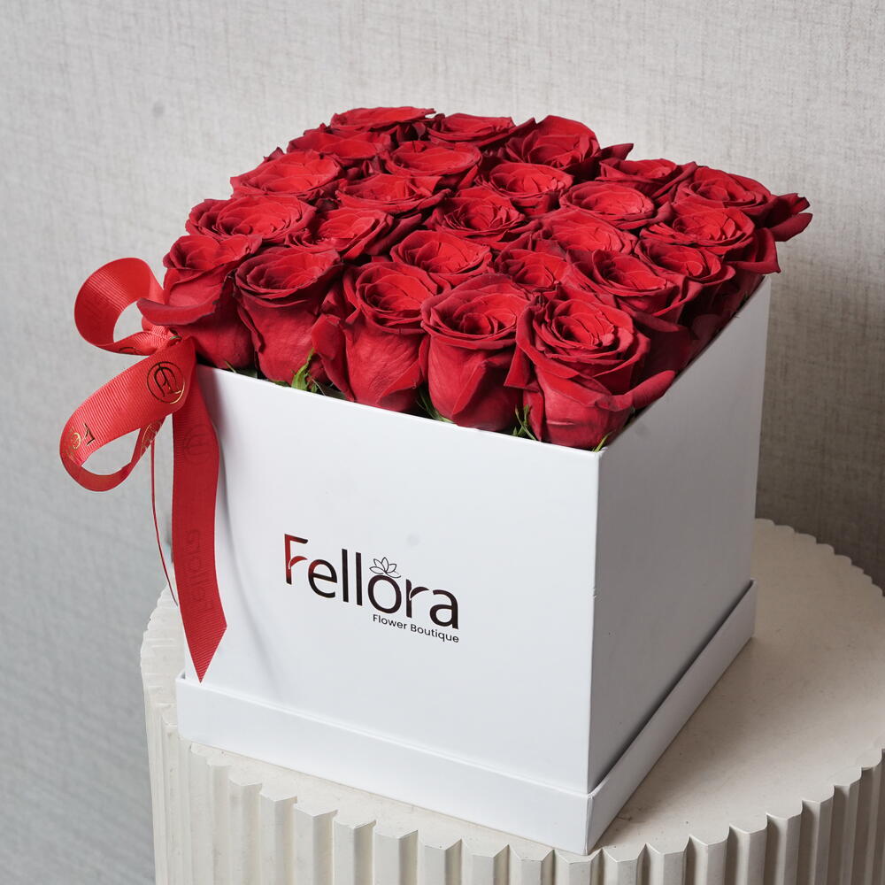 25 tallos de rosas dispuestos en una caja cuadrada blanca con una cinta.