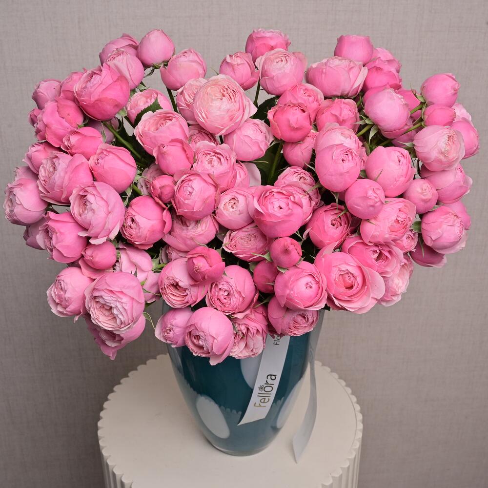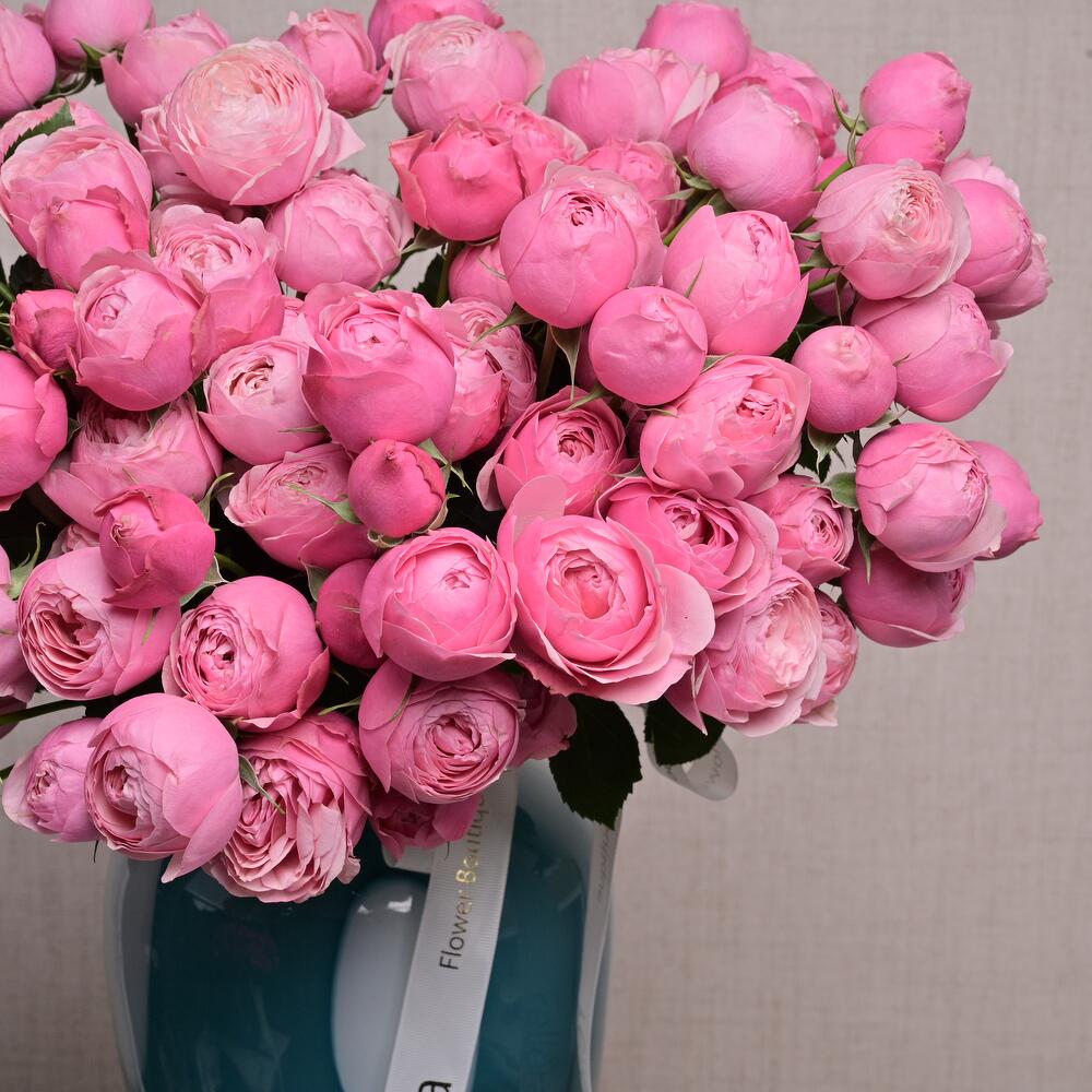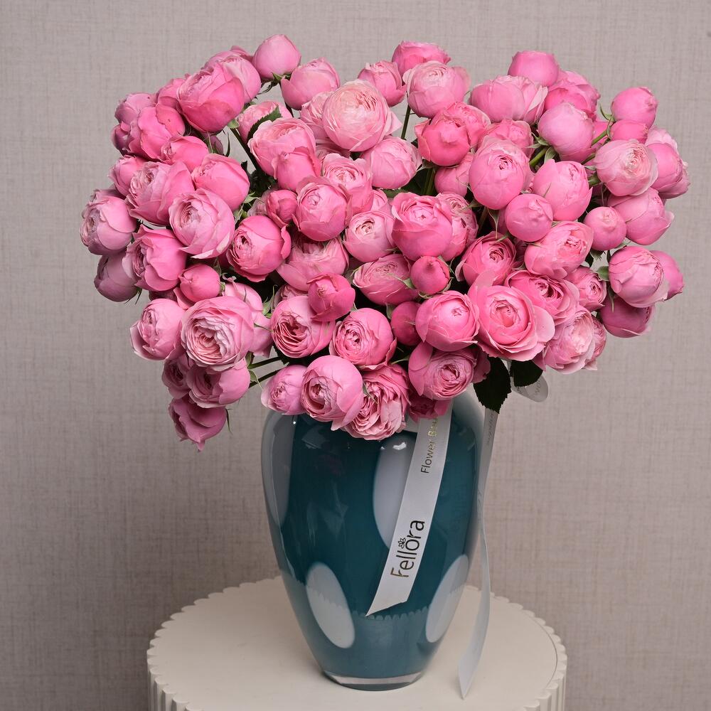Un lujoso arreglo de 25 rosas spray Silva Pink presentado en un elegante jarrón de vidrio azul con lunares. Ideal para regalar o para añadir un toque romántico a cualquier espacio.