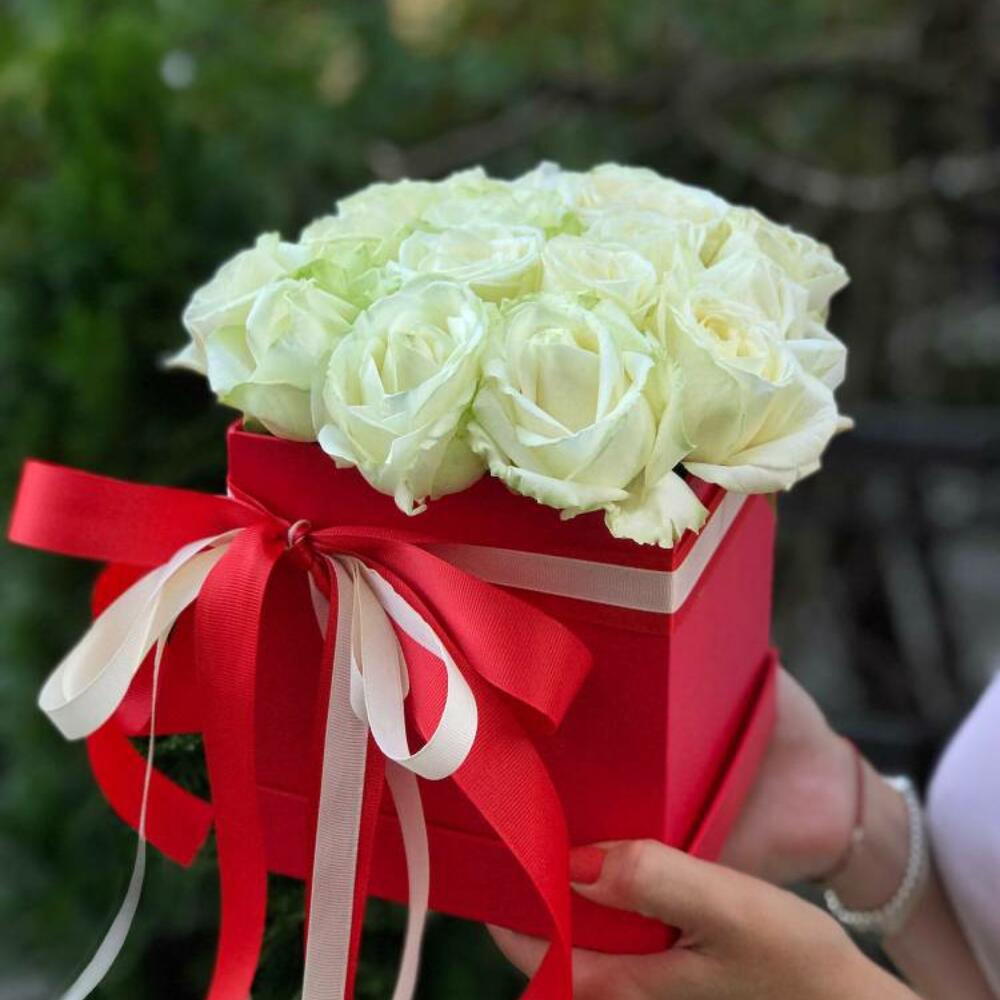 Composición: rosas blancas - 25, caja - 1, cinta - 2 Tamaños: ANCHO - 17CM; ALTO - 20CM; LARGO - 20CM; (incluyendo el embalaje) Tamaño: 17 x 20 x 20 cm