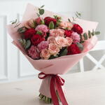 Un ramo colorido con 10 rosas rosadas, 4 claveles rosados, 4 claveles rojos y 4 rosas rojas, bellamente arreglado para transmitir amor, admiración y elegancia. Perfecto para cumpleaños, aniversarios o ocasiones especiales.