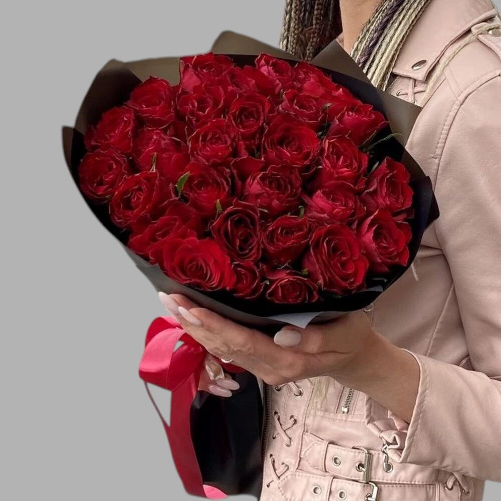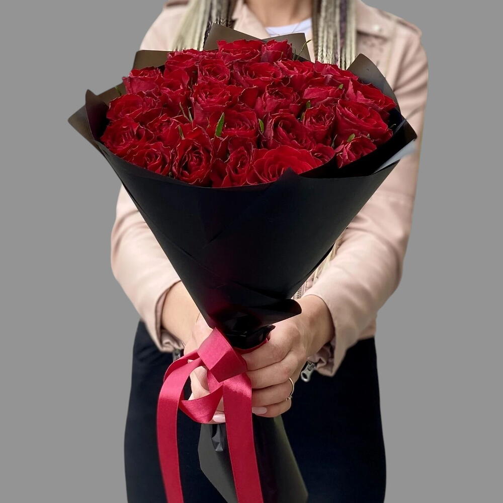31 rosas rojas premium en envoltorio negro para esposa