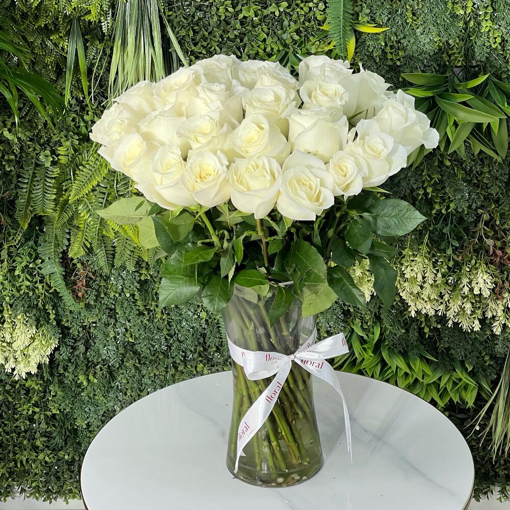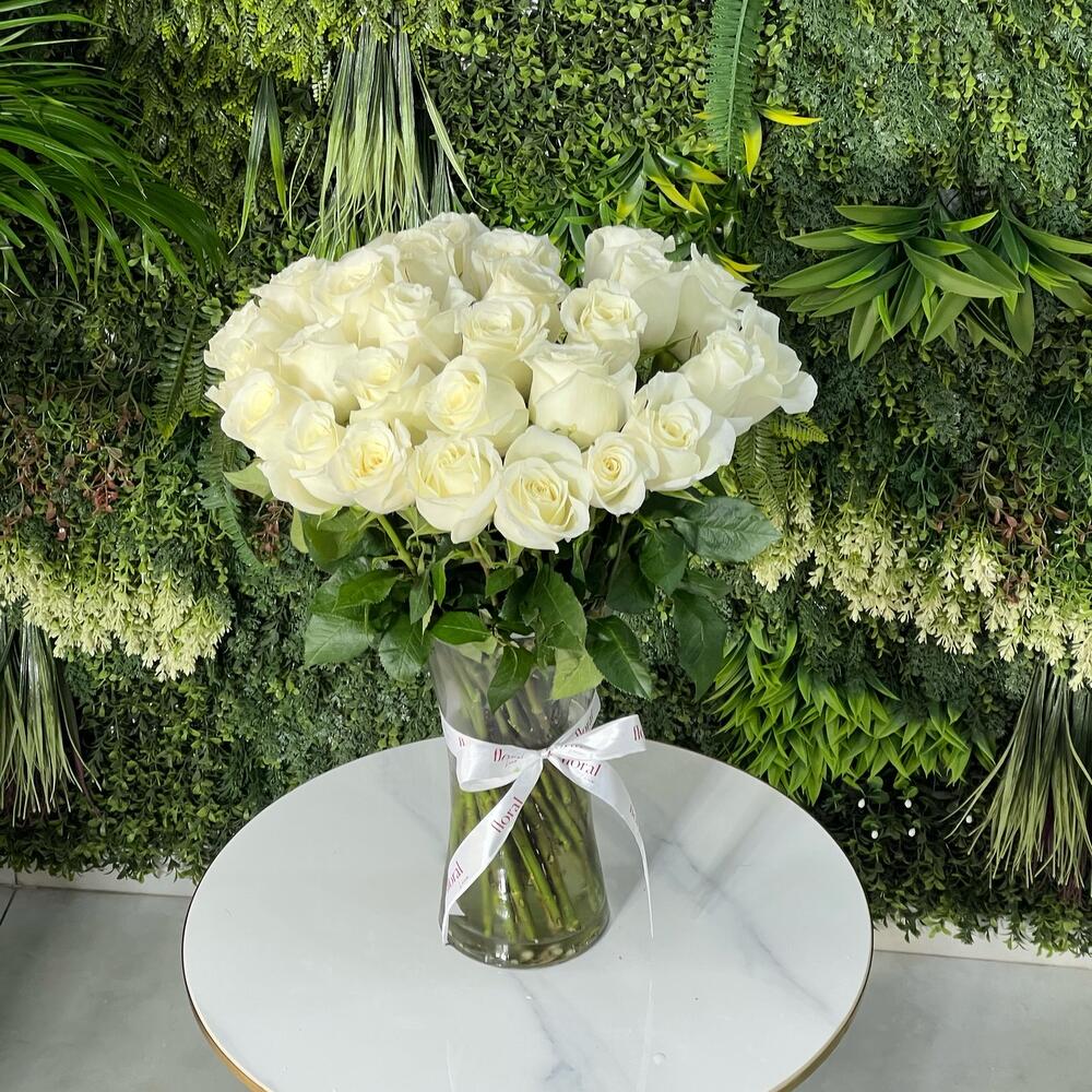 31 rosas de un blanco puro, arregladas hermosamente en un jarrón de cristal - un símbolo de paz, amor y elegancia atemporal. Perfectas para momentos emotivos, condolencias o amor puro.