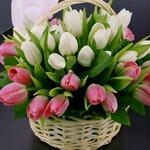 Canasta de 33 tulipanes mixtos – tulipanes en tonos rosa y blanco con lazo elegante