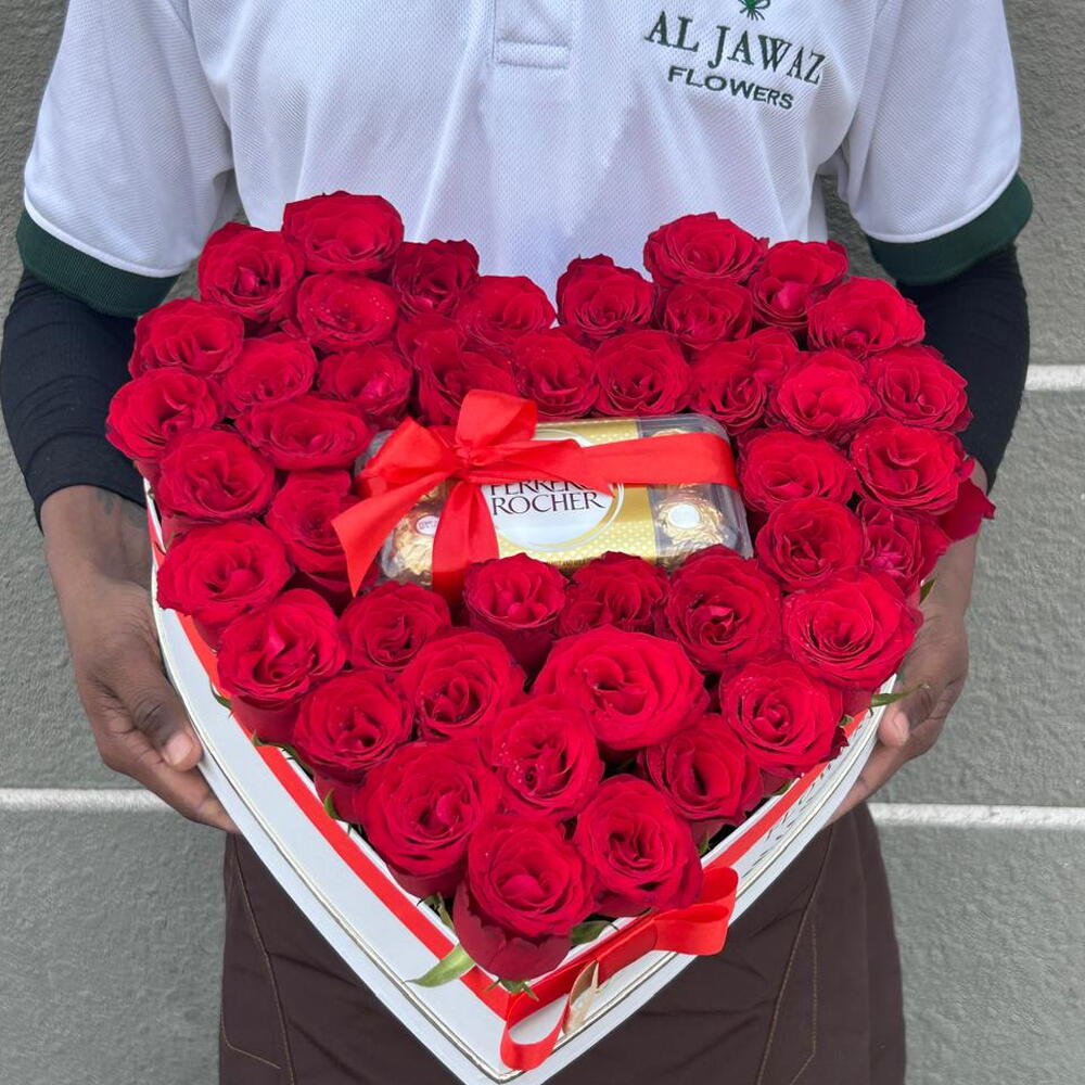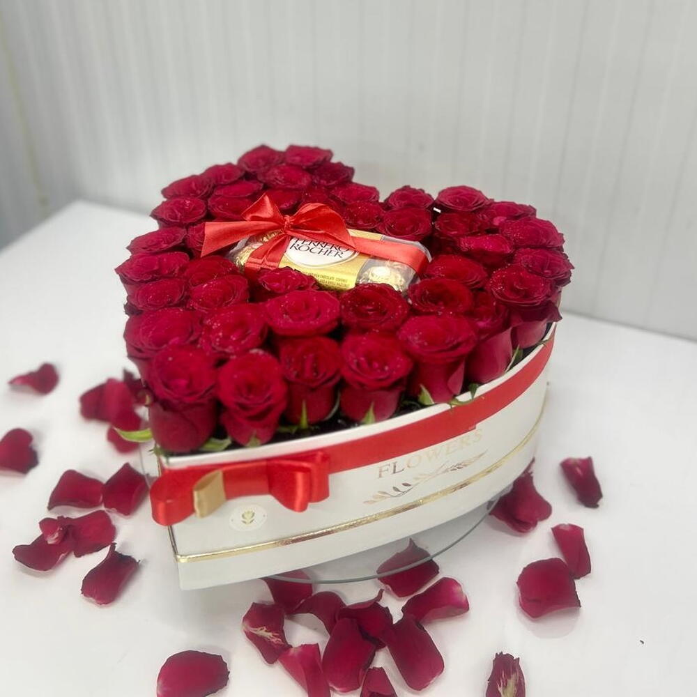 Caja en forma de corazón con 35 rosas rojas y Ferrero Rocher