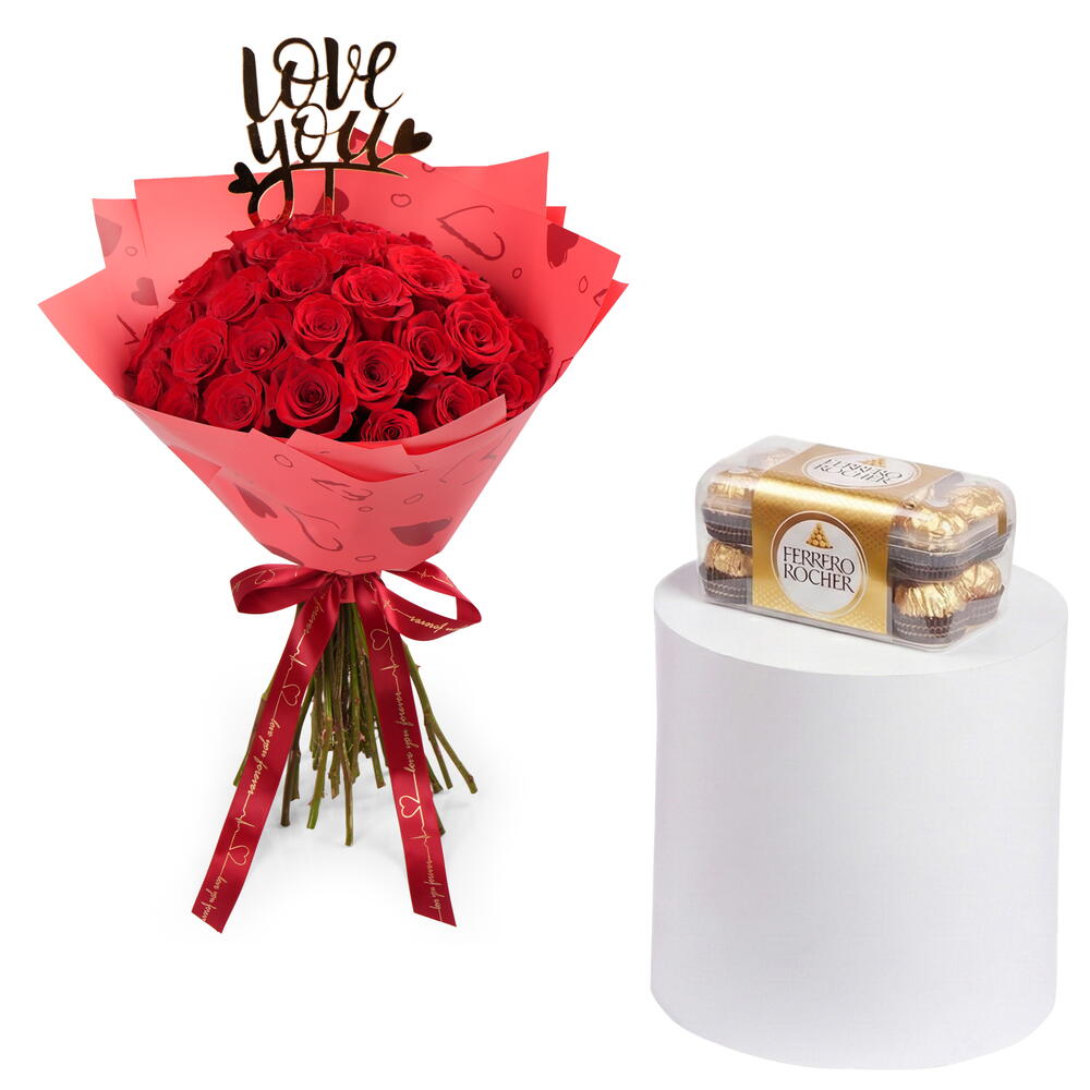 Ramo de 35 rosas rojas de amor con combo Ferrero Rocher