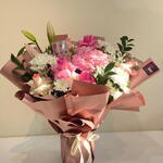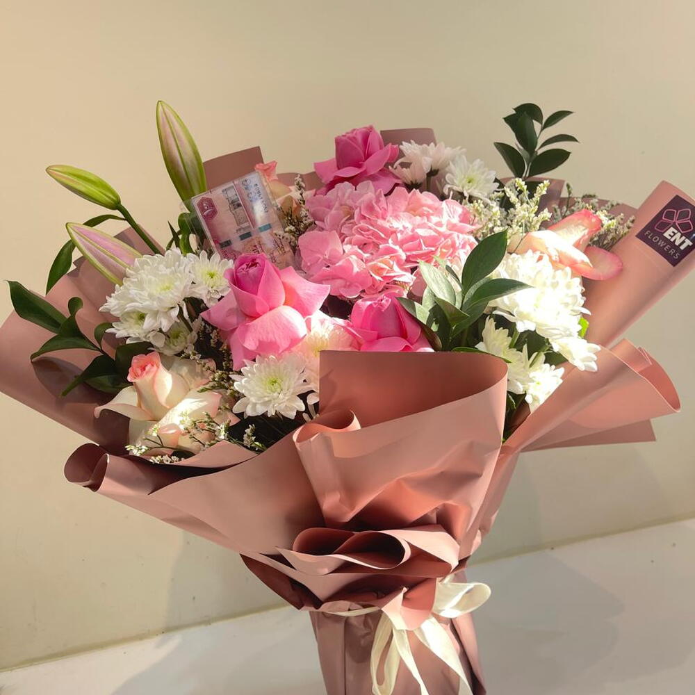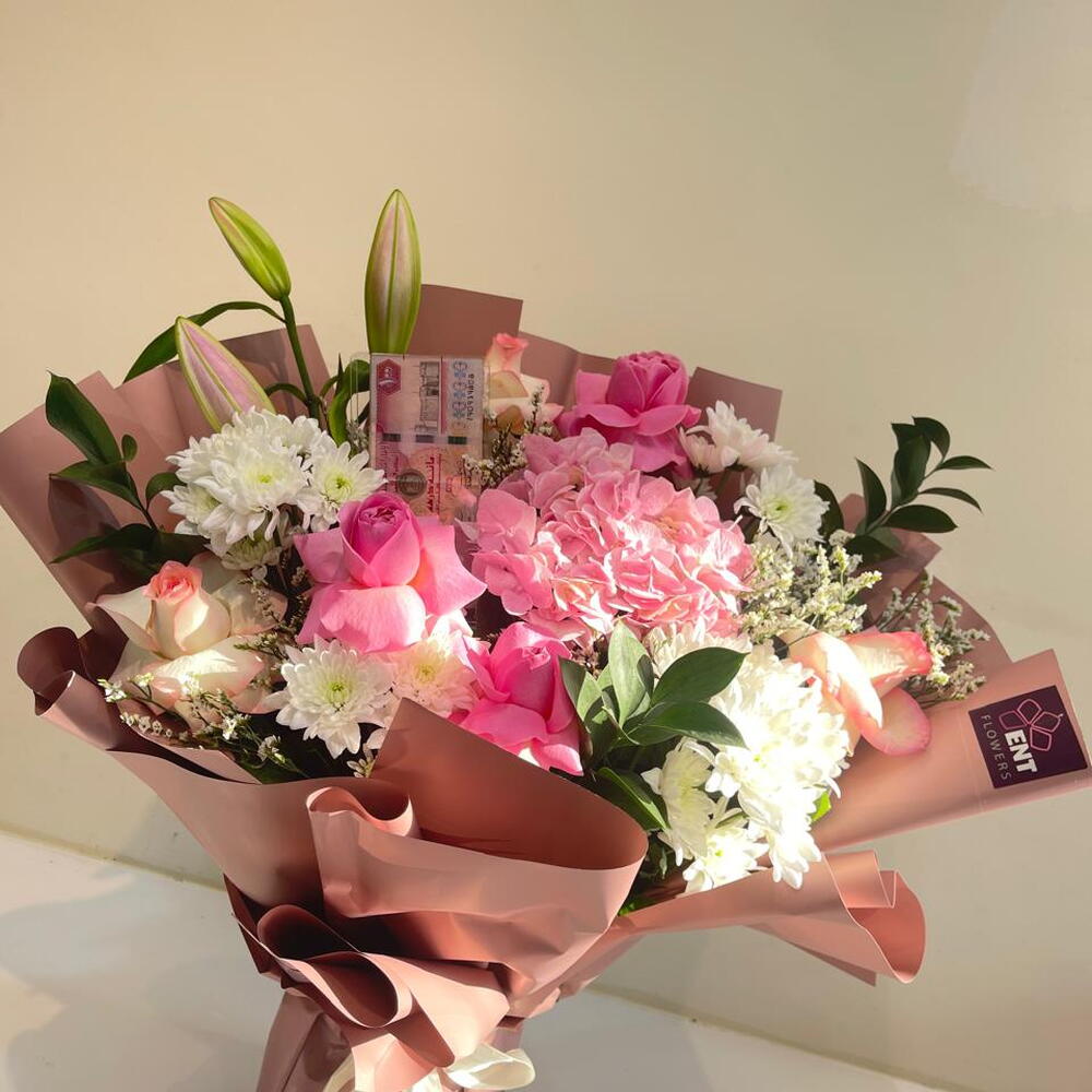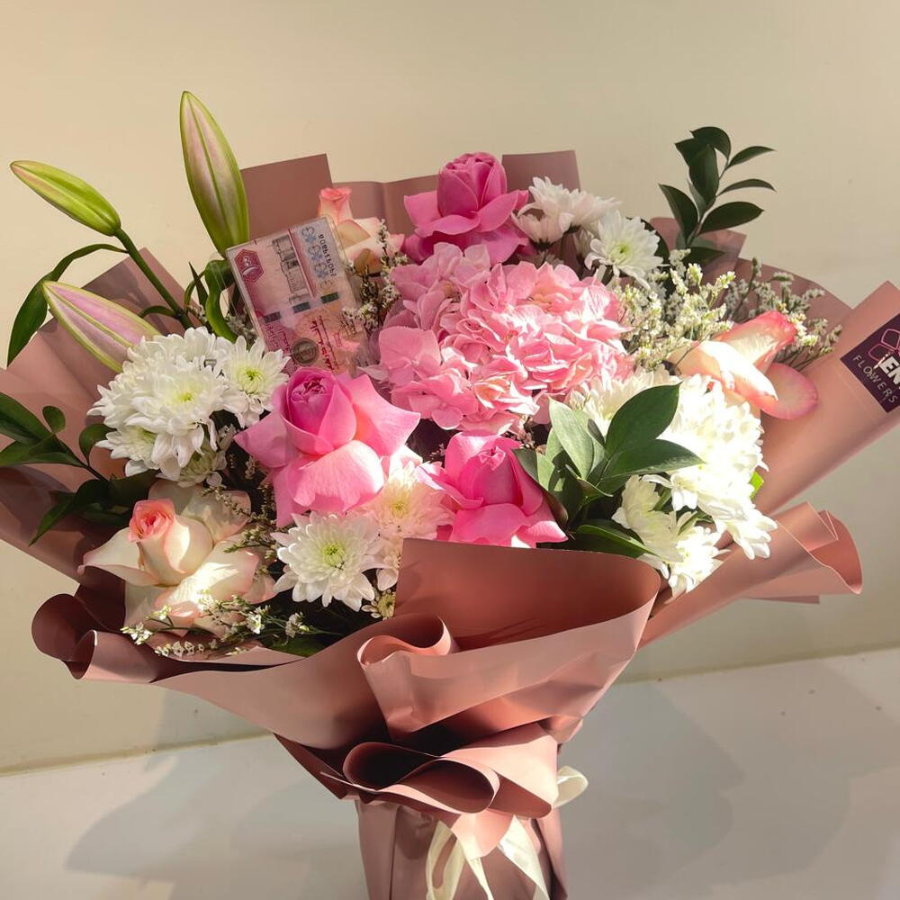 هذه باقة مختارة بعناية تضم مجموعة رائعة من الزهور الطبيعية. تحتوي الباقة على ثلاث قطع من الورد الوردي، وقطعتين من الضوء الوردي، وقطعة واحدة من زنبق الوردي. في الإضافة إلى ذلك، الباقة مزينة بقطعة واحدة من Haydrenga وأربع قطع من Crsathimum و Ruskas و Lemonioum. هذه الباقة مناسبة لجميع المناسبات وستضفي لمسة من الاناقة والرقي على أي مكان.