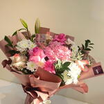 Pink rose - 3 ud. lirio rosa - 1 ud. limonio - 4 ud. crsathimum - 4 ud. hortensia - 1 ud. rosa claro - 2 ud. ruskas - 4 ud.