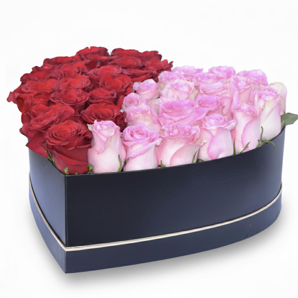 51 rosas rojas y rosadas en caja en forma de corazón- Colección de San Valentín