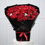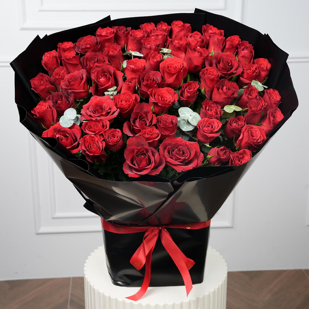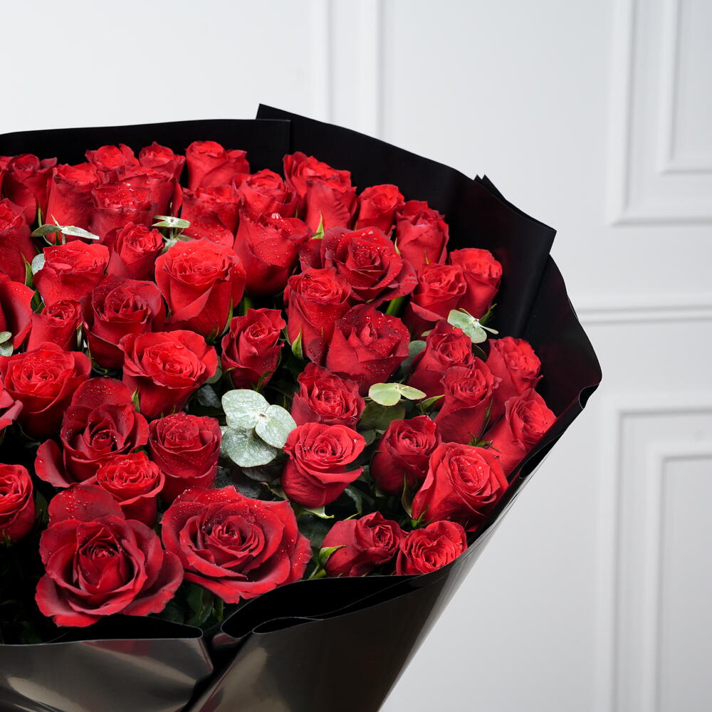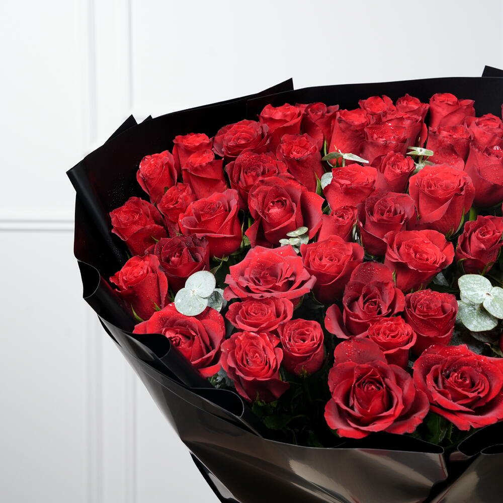 51 impresionantes rosas rojas dispuestas para crear un ramo lujoso y romántico. Acentuado con 3 tallos de eucalipto frescos para un toque natural y elegante. Envuelto en papel negro de primera calidad para un aspecto audaz y sofisticado. Perfecto para aniversarios, el Día de San Valentín, propuestas o celebraciones especiales. Pide este elegante ramo de rosas rojas para entrega el mismo día y momentos inolvidables.