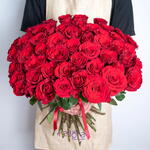 Ramo de 51 rosas rojas atado a mano sin envoltura y con cinta.
