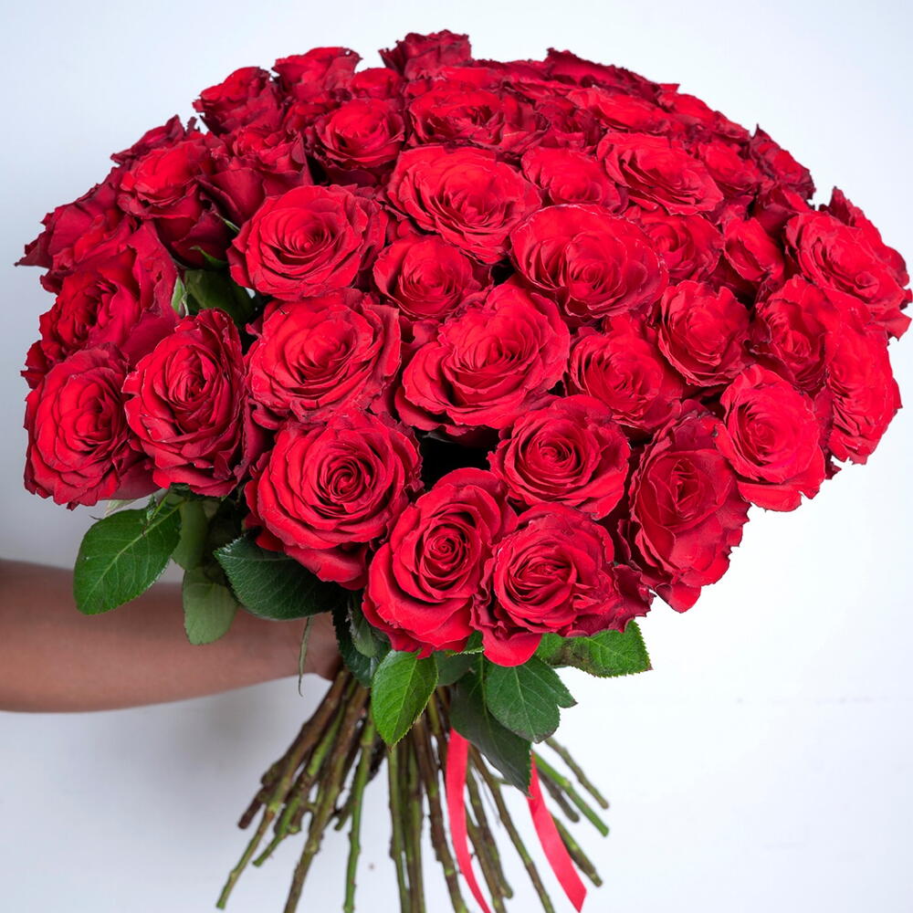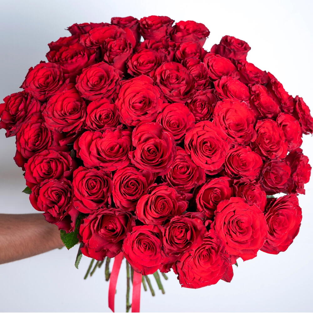 Ramo de 51 rosas rojas atado a mano sin envoltura y con cinta.