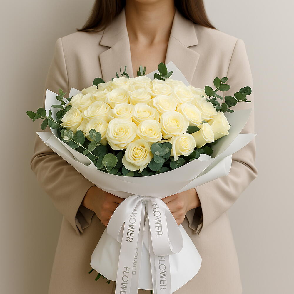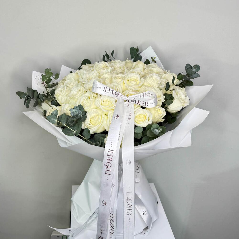 Hermoso ramo de 51 rosas blancas con eucalipto en envoltorio blanco.