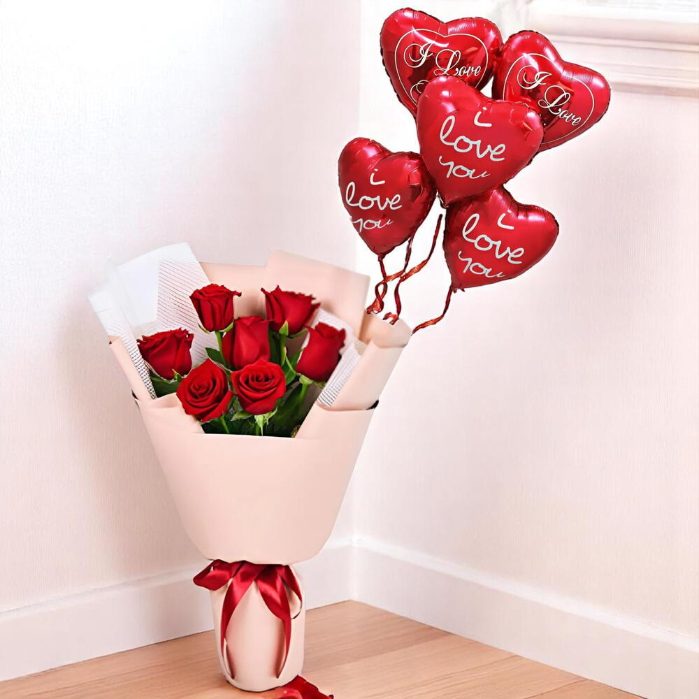 Di "Te amo" de la manera más encantadora con nuestro Combo de 7 Rosas Rojas con Globos Metálicos. Este emotivo arreglo incluye siete rosas rojas frescas, símbolo eterno del amor y la pasión, bellamente envueltas y atadas con un listón de satén. Complementado con cinco elegantes globos metálicos "Te amo" en forma de corazón, es un gesto romántico que dejará una huella imborrable. Perfecto para San Valentín, aniversarios, pedidas de mano o simplemente para recordarle a alguien cuánto significa para ti. Instrucciones de cuidado: Sumerge los tallos de las rosas en agua limpia inmediatamente después de recibirlos. Cambia el agua a diario y recorta las puntas para mantenerlos frescos. Manténlos alejados de la luz solar directa y del aire acondicionado. Los globos metálicos suelen permanecer inflados de 24 a 48 horas en interiores.