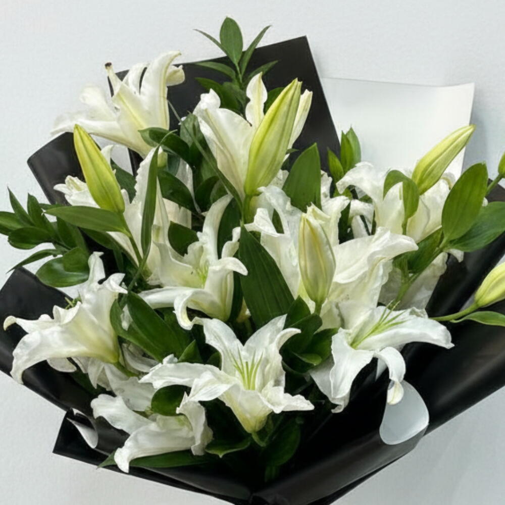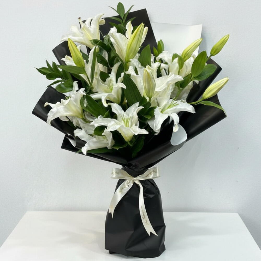 Un elegante ramo de 7 lirios blancos frescos, envuelto en elegante negro, que simboliza pureza, paz y belleza atemporal. Perfecto para sorpresas románticas, regalos corporativos o gestos elegantes, este ramo demuestra que a veces menos es realmente más. Su diseño sobrio y su presentación elegante lo convierten en un regalo atemporal adecuado para cualquier ocasión. ✔️ 7 tallos premium, seleccionados a mano por su calidad ✔️ Presentado en un elegante envoltorio negro para un aspecto moderno ✔️ Entrega de flores el mismo día disponible en todo Dubái ✨ Regala elegancia en su forma más pura. Pide hoy el Ramo de 7 Tallos con Envoltorio Negro — ¡entregado fresco, el mismo día en Dubái!