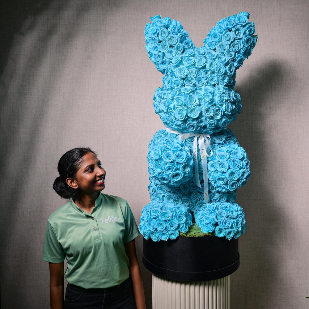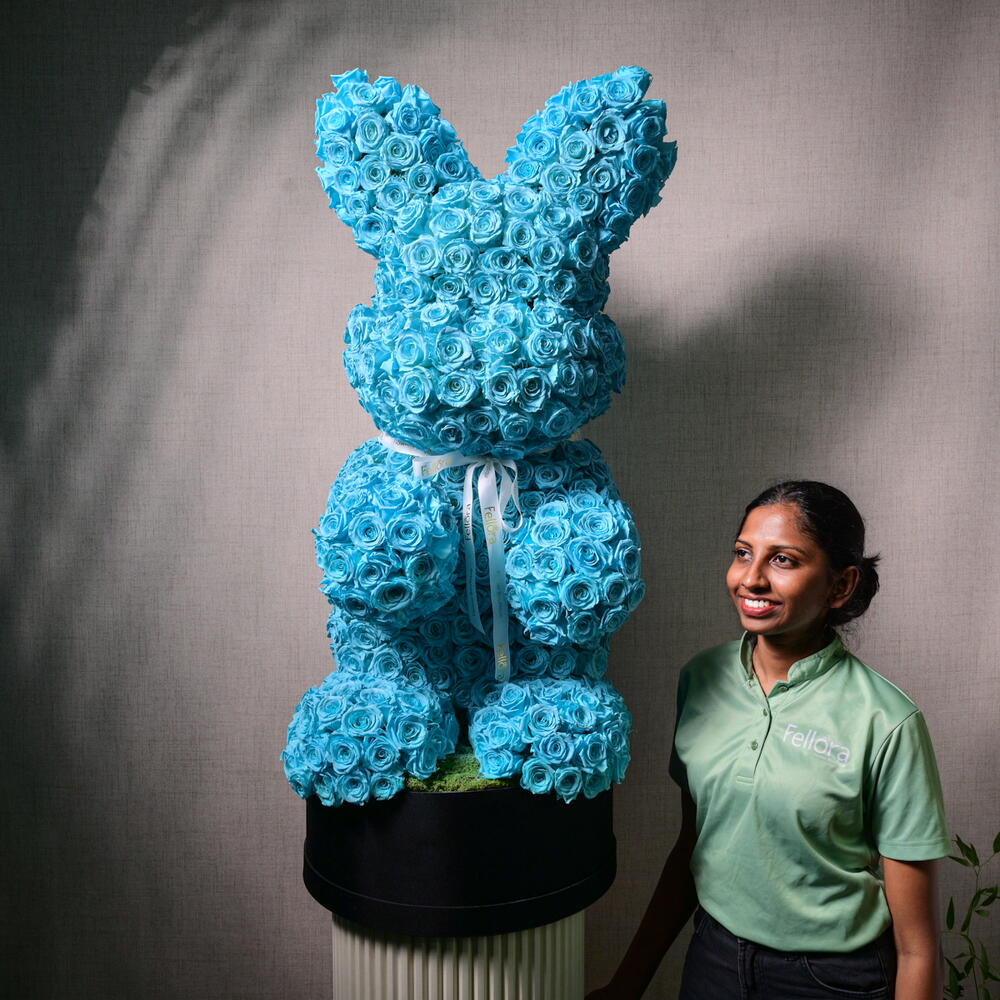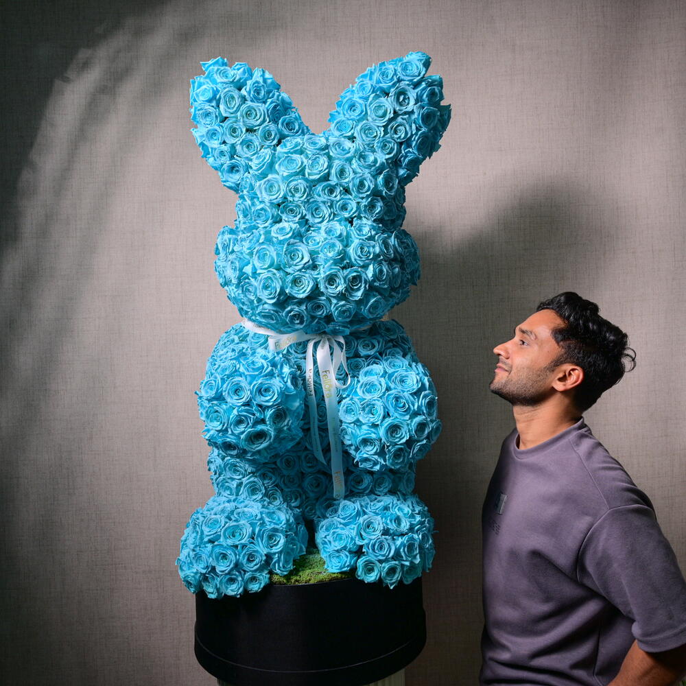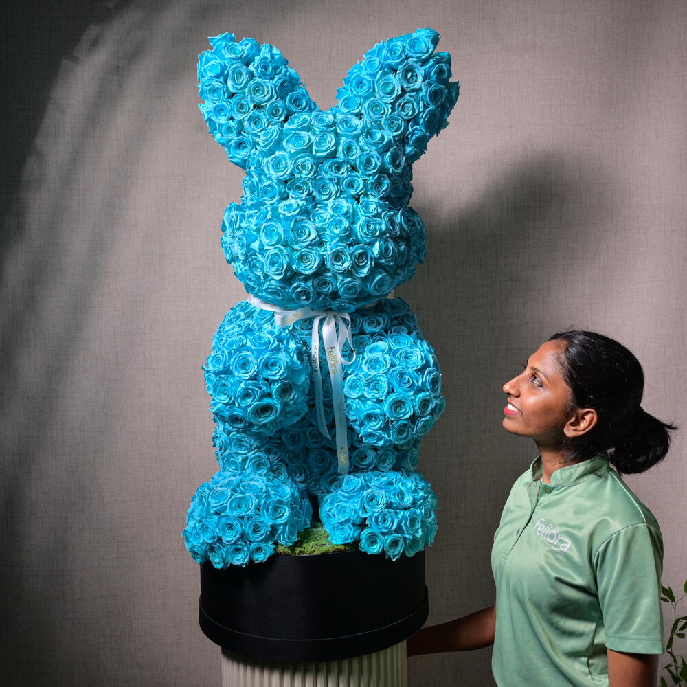 Deléitate con la belleza y el encanto del Blue Rose Bunny, un arreglo floral único que combina elegancia y fantasía. Elaborado con 701 rosas azules preservadas y pintadas con spray, este impresionante conejito de flores es un regalo perfecto para ocasiones especiales como cumpleaños, Pascua o como un gesto inolvidable de amor y admiración. El suave tono azul, junto con la delicada cinta, añade un toque de sofisticación a esta extraordinaria escultura floral.