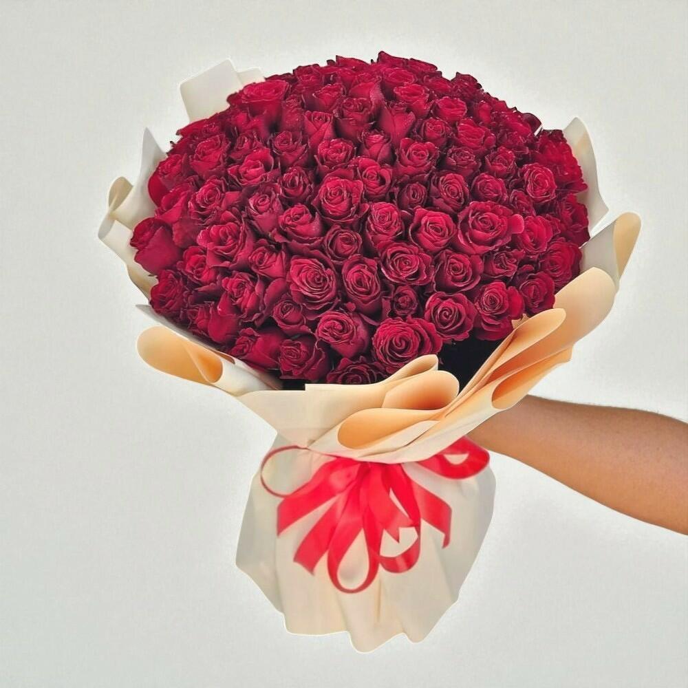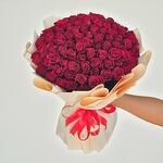 Este lujoso ramo de rosas de un rojo intenso es un símbolo atemporal de pasión y elegancia. Los ricos pétalos aterciopelados están dispuestos con maestría para crear una forma voluminosa y redondeada que deja sin aliento. Envuelto en delicado papel color crema y atado con una romántica cinta roja, es perfecto para aniversarios, propuestas o cualquier celebración especial. El color vibrante y la fragancia natural llenan cualquier espacio de calidez y amor. Para conservar su aspecto fresco, coloque el ramo en un lugar fresco, alejado de la luz solar directa y de corrientes de aire. Renueve el agua cada dos días y recorte los tallos ligeramente en ángulo para prolongar su vida. Este ramo será un impresionante recordatorio de momentos inolvidables.