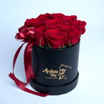 15 rosas rojas arregladas en una caja redonda negra con cinta roja