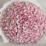 un gran y lujoso ramo de rosas atado a mano, Las flores están dispuestas en una forma densa y redondeada y están envueltas en papel blanco, presentado sobre una superficie blanca.