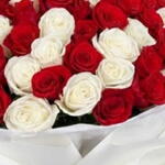 un ramo grande y lujoso de rosas rojas y blancas, agrupadas densamente en forma de cúpula redondeada. Las rosas, con pétalos aterciopelados rojos o blancos, a menudo se venden en arreglos de alrededor de 99 rosas como un gesto grandioso de admiración, gracia y profundo agradecimiento.