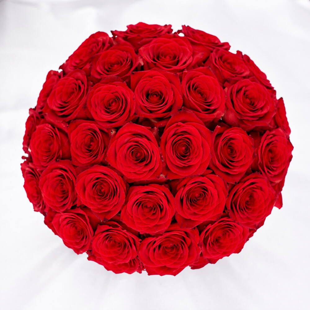 Make a bold statement of love with this luxurious arrangement of 35 premium red roses, carefully hand-selected for their rich color and flawless bloom. Expertly arranged into a full, perfectly rounded design, each rose comes together to create a breathtaking display of romance and elegance. Presented in a sophisticated black hat box, this arrangement exudes timeless luxury while offering effortless convenience—no vase required, just place and admire. Every detail is thoughtfully crafted to deliver a striking visual impact, making it a true symbol of deep love, passion, and admiration. Perfect for Valentine’s Day, anniversaries, proposals, or any grand romantic gesture, this exquisite creation is designed to leave a lasting impression and create unforgettable moments.