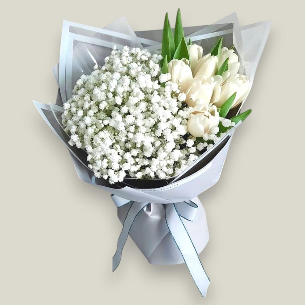 Tulips - 10 ud. Gypsophila - 5 ud. tarjeta - 1 ud.
