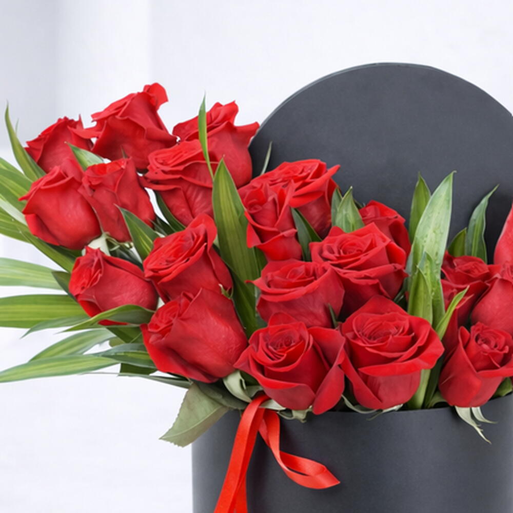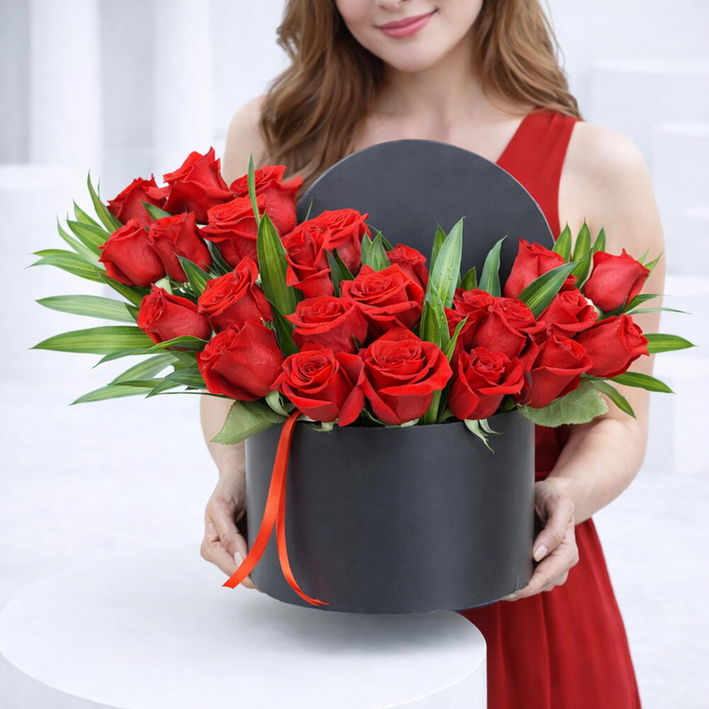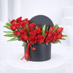 25 rosas rojas Hojas - 2-3 tallos de Song of India Preparado en una caja redonda negra mediana Atado con una cinta roja